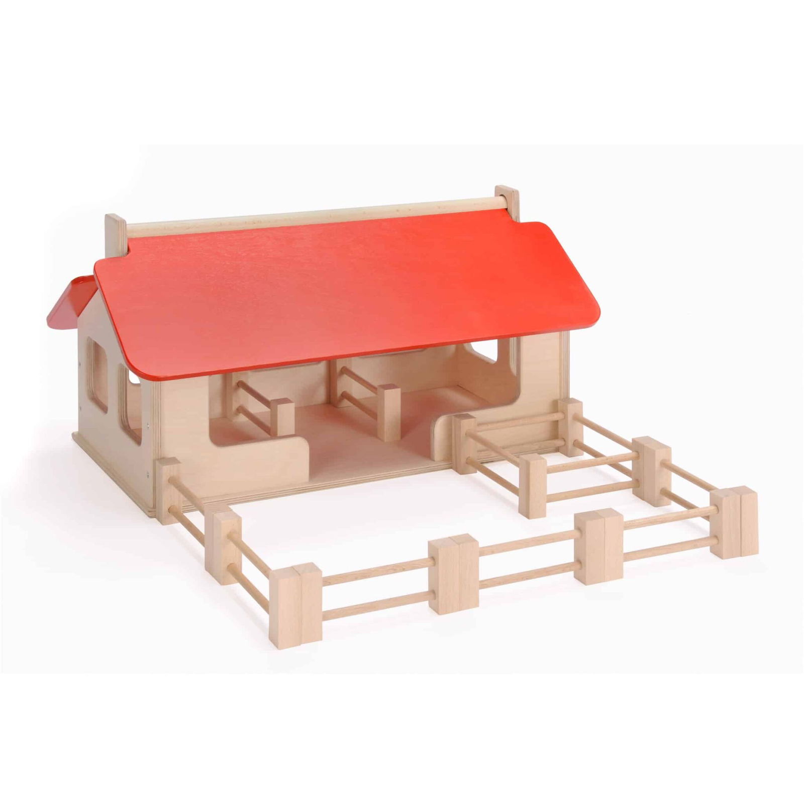 Bauernhof aus Holz – Die Zaunelemente können variabel aufgestellt werden. Das Dach ist aufklappbar für bequemes Bespielen. Nach dem Spielen wird alles im Haus verstaut und an der Firststange weggetragen.