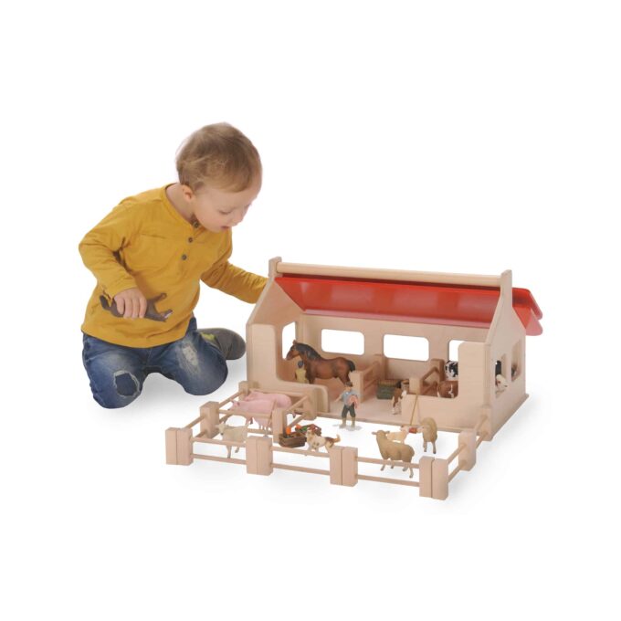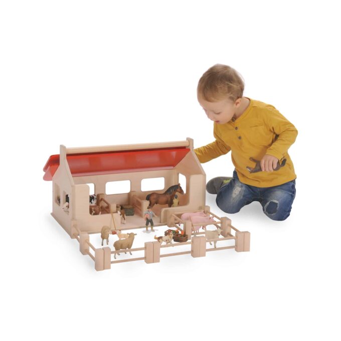 Bauernhof aus Holz – Die Zaunelemente können variabel aufgestellt werden. Das Dach ist aufklappbar für bequemes Bespielen. Nach dem Spielen wird alles im Haus verstaut und an der Firststange weggetragen.