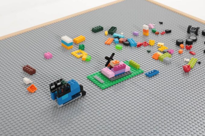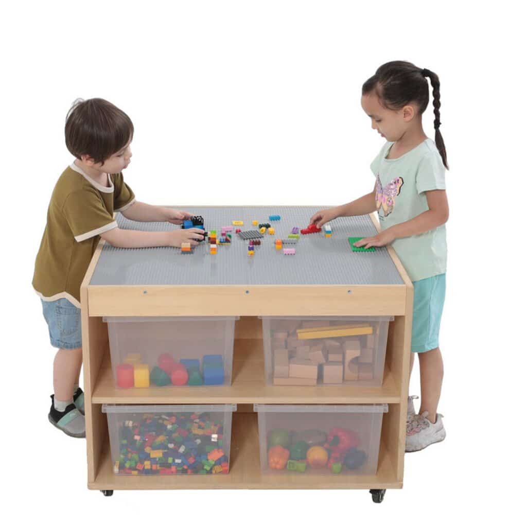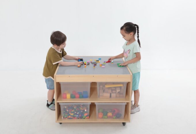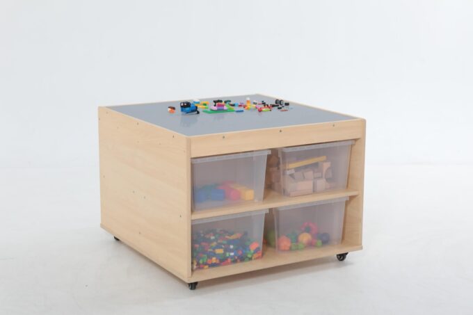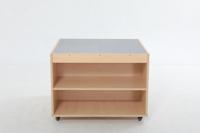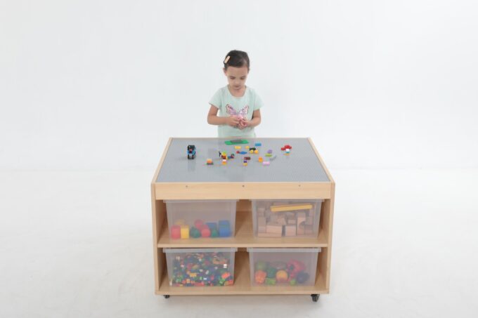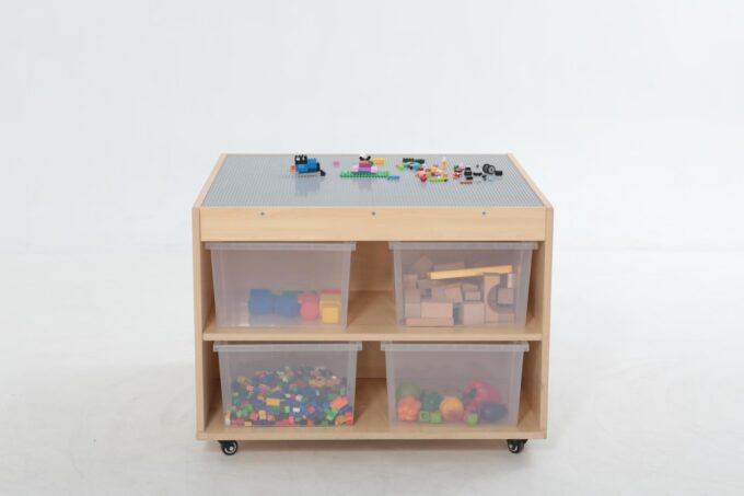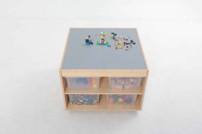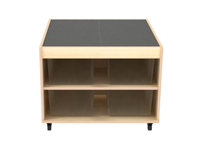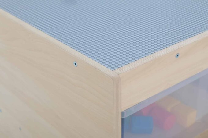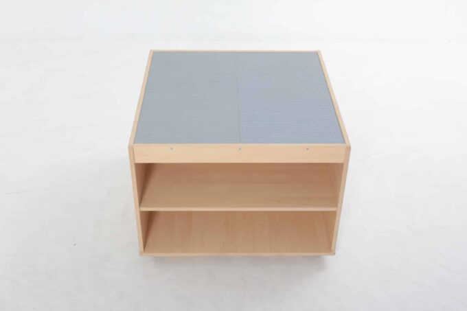 Schluss mit Bausteinen, die im ganzen Raum verstreut sind. Unter der Spielfläche befinden sich vier riesige, leicht zugängliche Fächer. Hier finden tausende von Klemmbausteinen Platz und können nach Farbe, Form oder Größe sortiert werden. Das Aufräumen wird zum Kinderspiel und die Kinder lernen, Verantwortung für ihr Spielmaterial zu übernehmen. Alles ist an einem Ort und sofort wieder spielbereit. - Mobil und flexibel dank hochwertiger Rollen