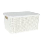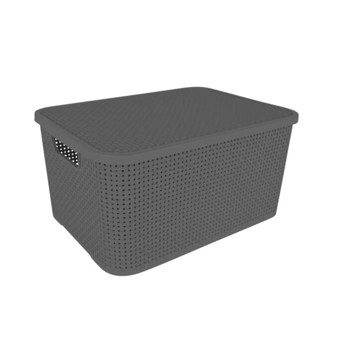 Mit einem Fassungsvermögen von 19 Litern und den Maßen 38 x 28 x 18,5 cm bietet dieser Behälter reichlich Platz für allerlei Gegenstände. Der robuste Kunststoff sorgt für Langlebigkeit und die ansprechende Rattan-Optik verleiht jedem Raum eine elegante Note. Dank der praktischen Grifföffnungen lässt sich der Behälter leicht tragen und transportieren, während der Deckel den Inhalt sicher schützt und ordentlich verstaut hält.