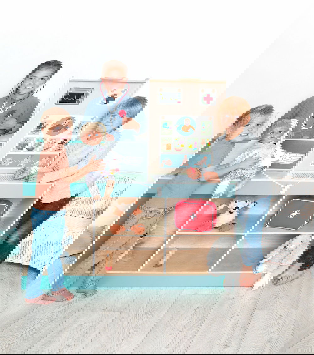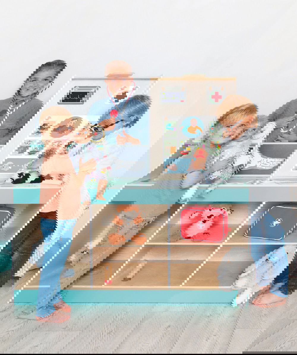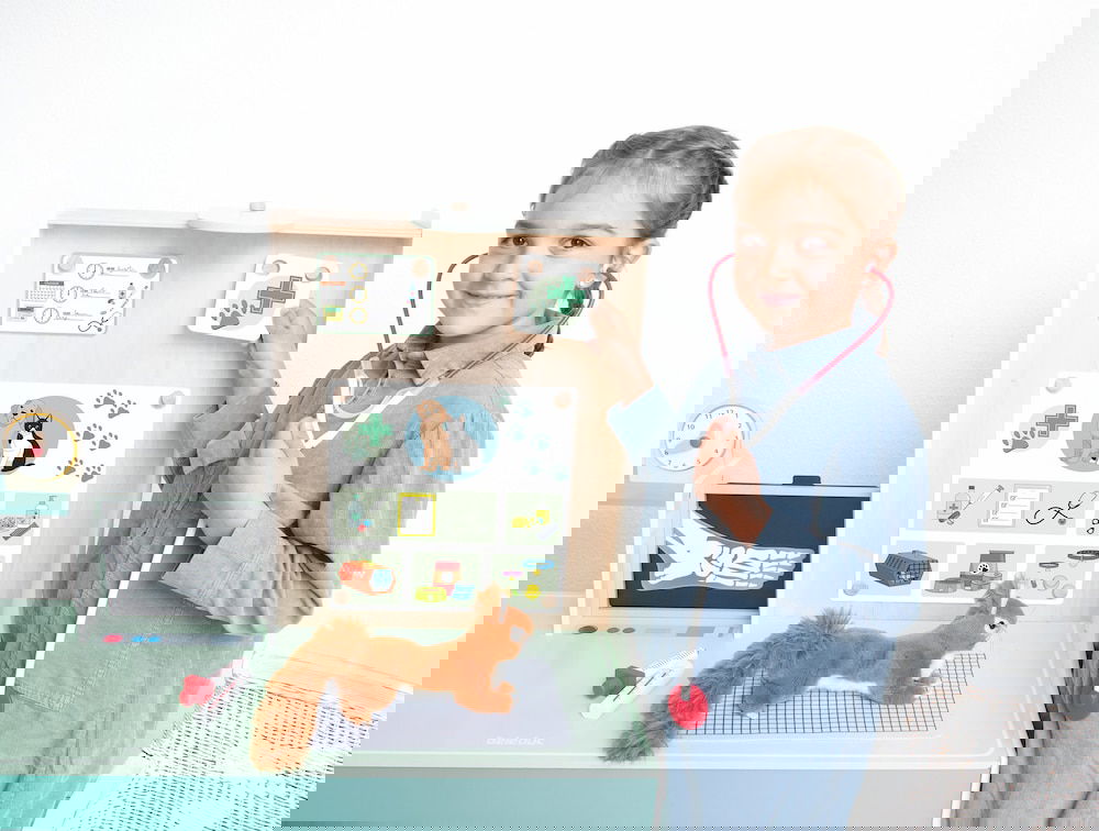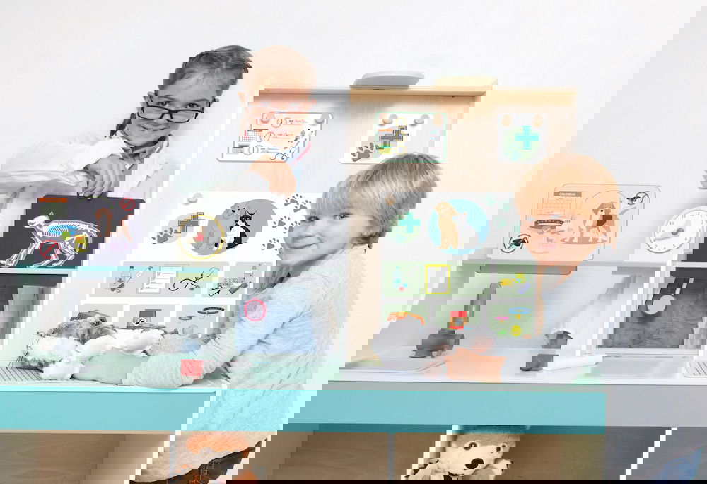 Kinderarzt, Tierarzt, Optiker und vieles mehr! Die „Doctor Station“ lässt den Kindern viel Frei-raum für kreatives und freies Rollenspiel. In welche Rolle schlüpfst du? Ideal für den Kindergarten. Es kann von beiden Seiten bespielt werden und bie-tet zahl reiche Möglichkeiten, wie zum Beispiel Durchführung von Sehtests, Größe messen und Röntgenbilder anschauen. Die Kinder können so-wohl Kinderarzt, als auch Tierarzt spielen, da die Karten aus gewechselt werden können. Hierbei können Plüschtiere und Puppen als Patienten genommen werden.
