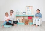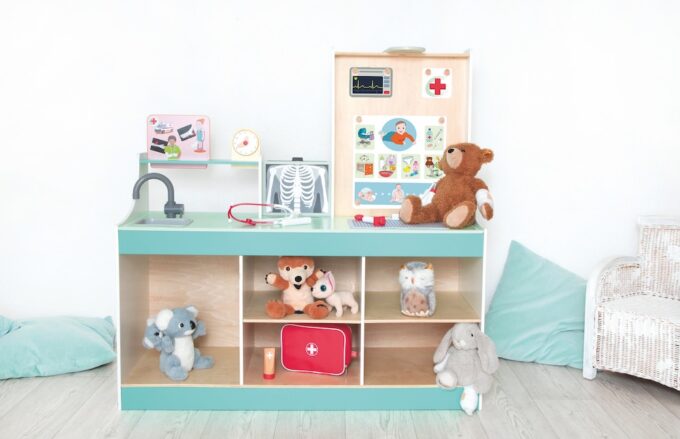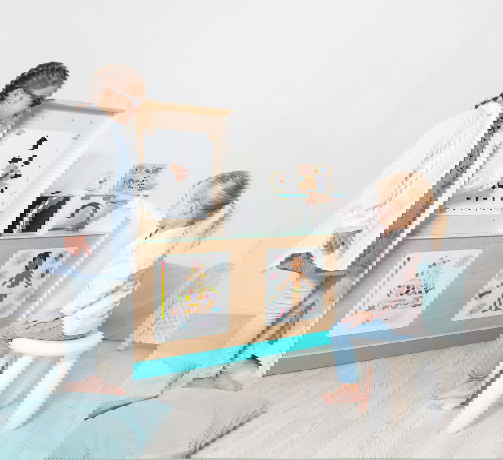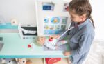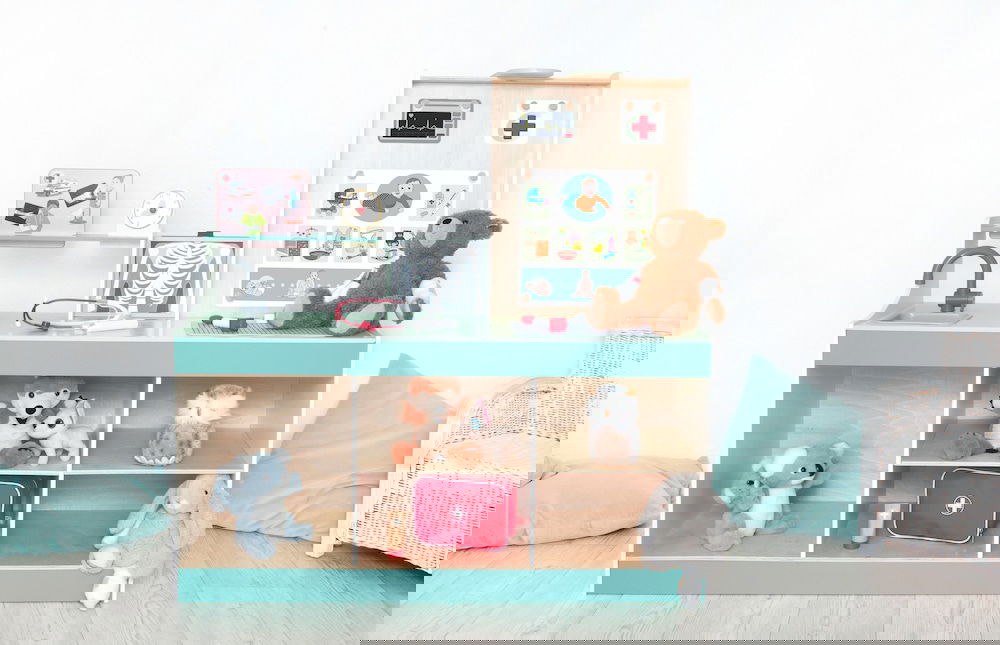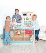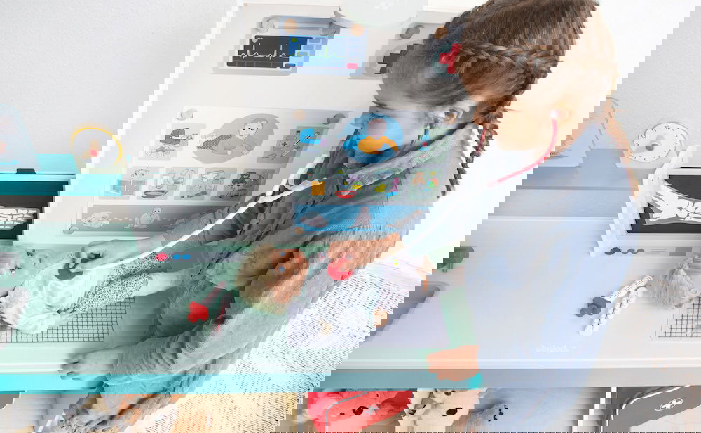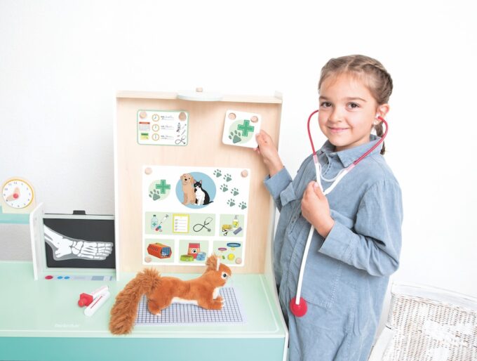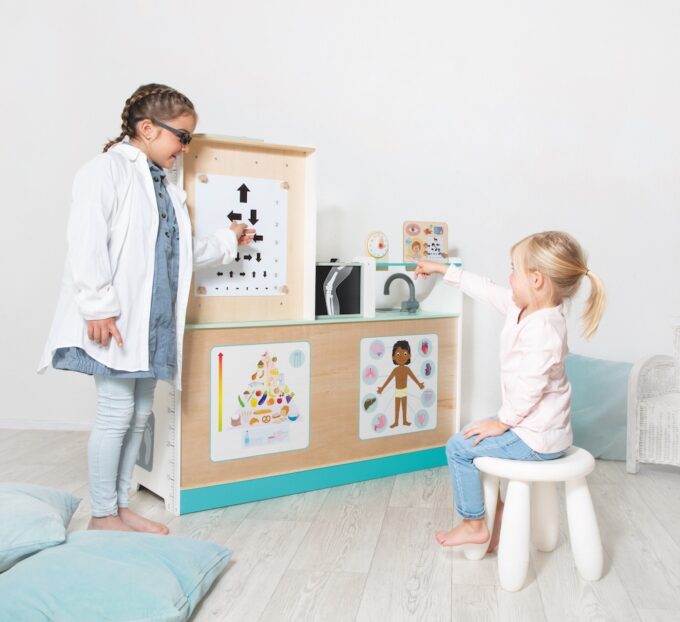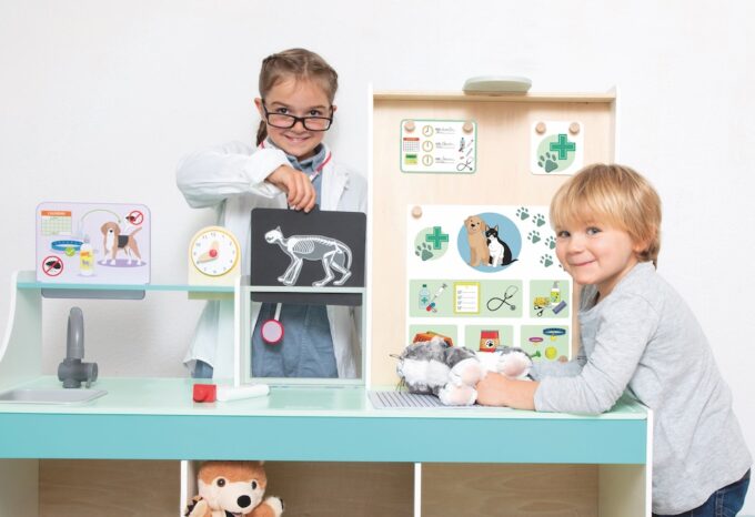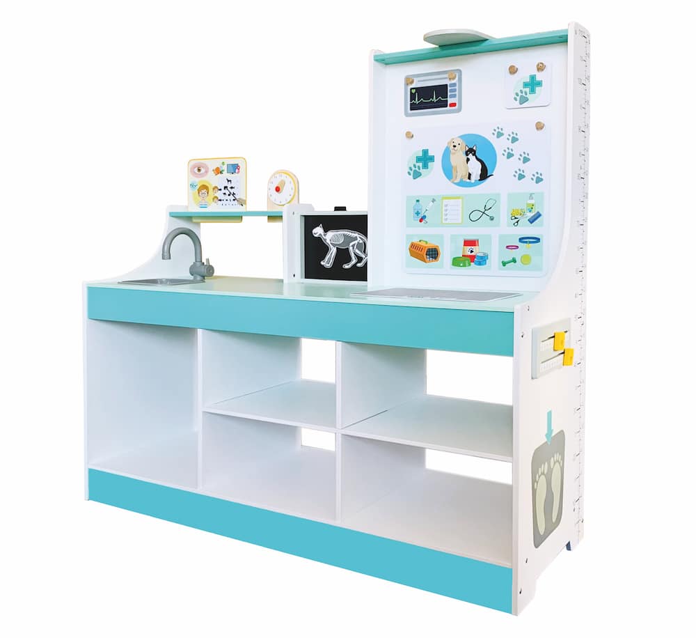 Kinderarzt, Tierarzt, Optiker und vieles mehr! Die „Doctor Station“ lässt den Kindern viel Frei-raum für kreatives und freies Rollenspiel. In welche Rolle schlüpfst du? Ideal für den Kindergarten. Es kann von beiden Seiten bespielt werden und bie-tet zahl reiche Möglichkeiten, wie zum Beispiel Durchführung von Sehtests, Größe messen und Röntgenbilder anschauen. Die Kinder können so-wohl Kinderarzt, als auch Tierarzt spielen, da die Karten aus gewechselt werden können. Hierbei können Plüschtiere und Puppen als Patienten genommen werden.