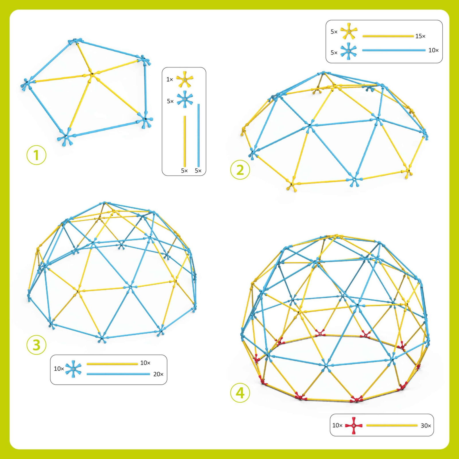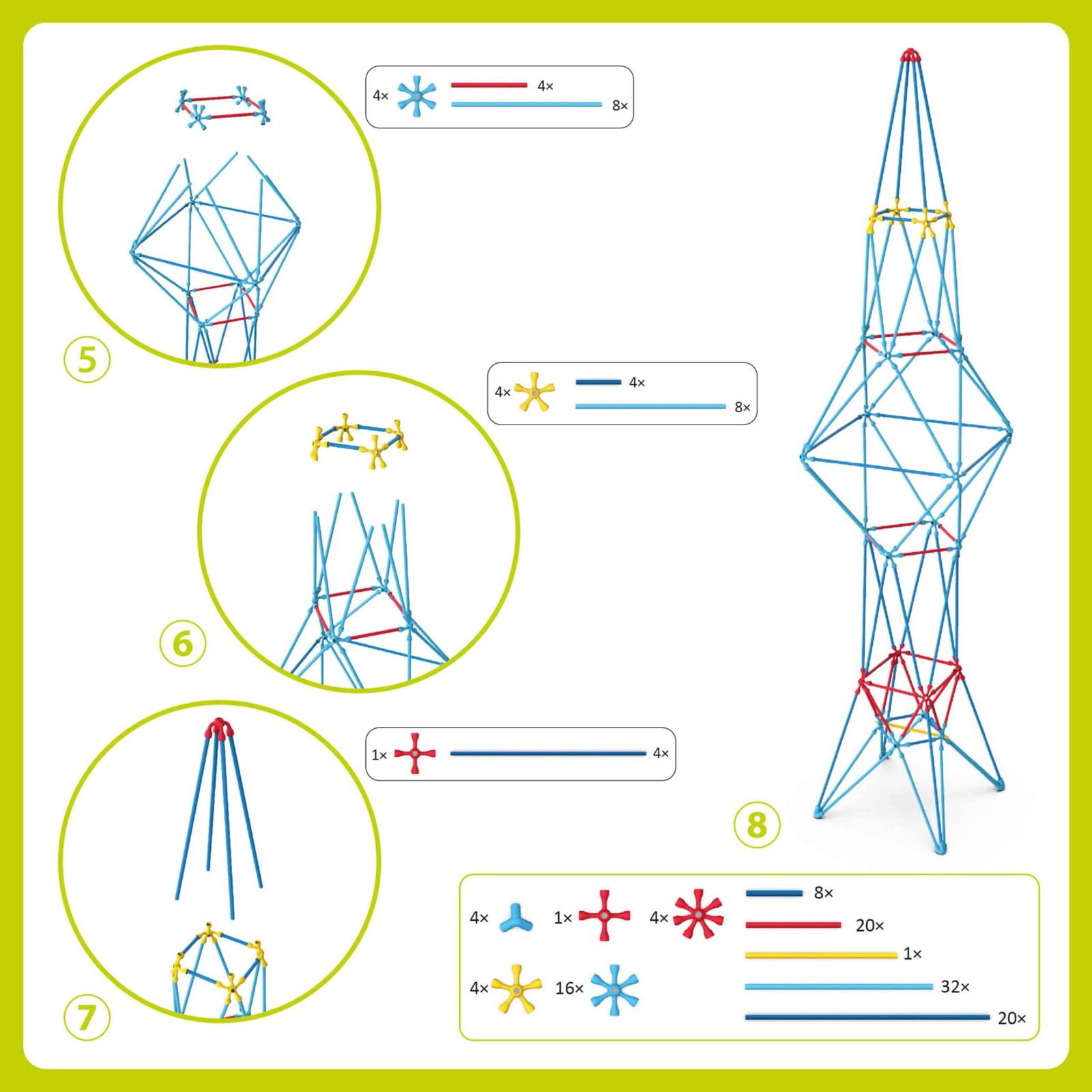 Die bunten Bambusstäbe mit flexiblen Verbindern laden die Kinder zum endlosen kreativen Bauen ein. 20 Vorlagekarten geben Anhaltspunkte, wie das Stecksystem genutzt werden kann und erste Inspirationen für unterschiedlichste Bauwerke. Mit den Stäben können geometrische Formen, sowie tolle große Projekte realisiert werden. Schnell lernen die Kinder, wie die unterschiedlichen Teile zusammengesteckt werden und können eigene, große Konstruktionen erschaffen.