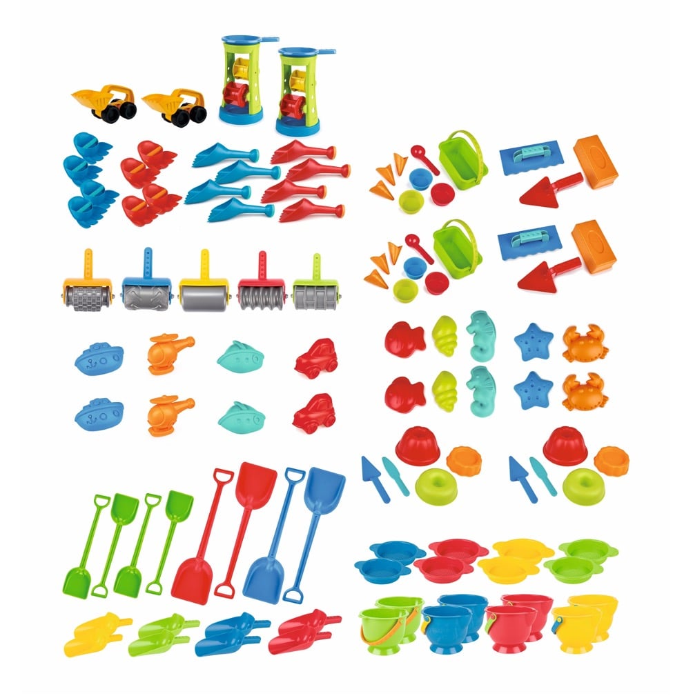 Das vielseitige Set ist sorgfältig aus SET „SPEZIAL“, SET „STABIL“ und SET „FORMEN & BAUEN“ zusammengestellt und bietet neben klassischen Spaten und Eimern auch außergewöhnliche Power-Krallen, Regenschaufeln und Strukturroller für einzigartige Sandkunstwerke.