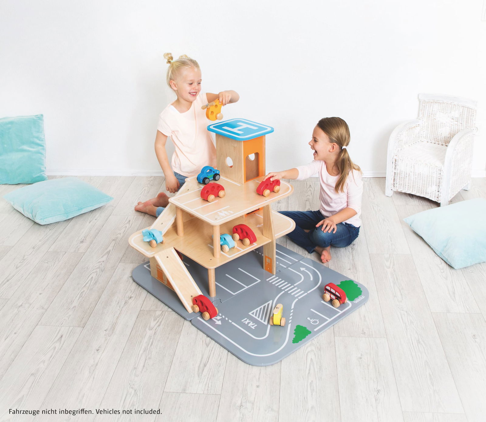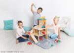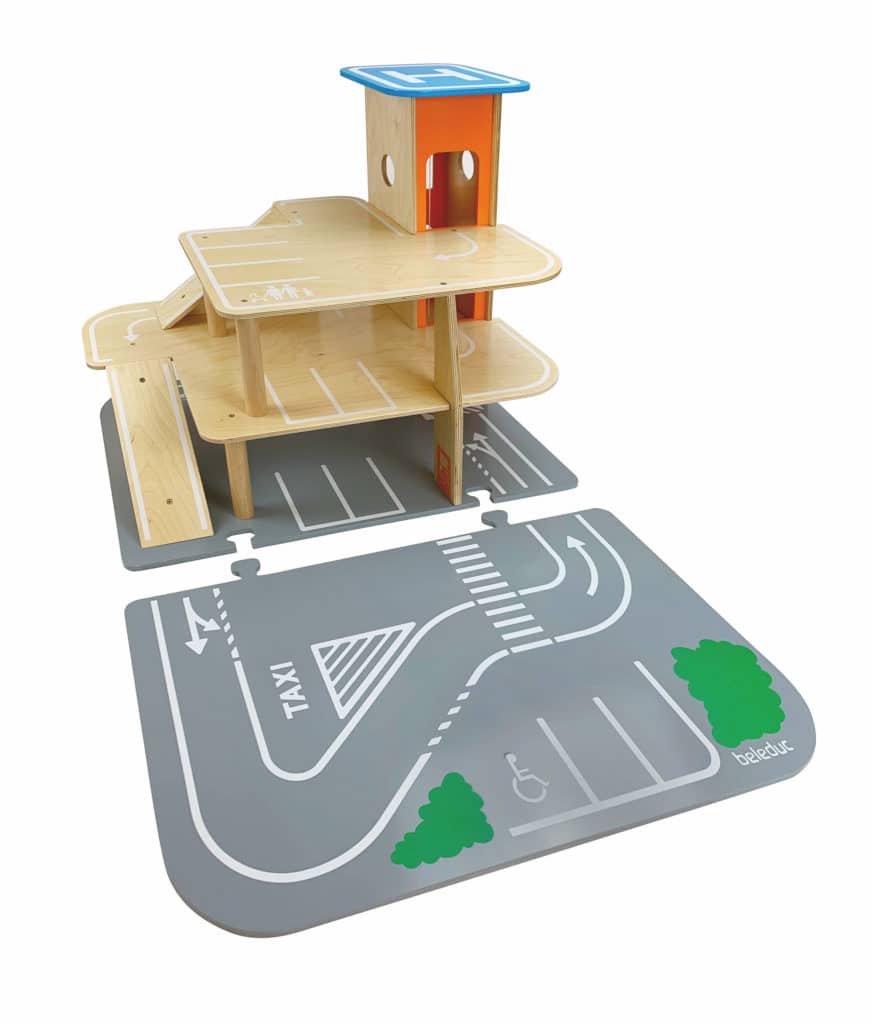 Egal ob parken, tanken, waschen, reparieren – das XXL City-Parkhaus von beleduc steckt voller Ideen und ist von allen Seiten bespielbar. Auf drei Ebenen können Autos in der Garage geparkt werden oder die Rampen in einem Rutsch hinunterflitzen oder es geht direkt von der Anfahrtsstraße auf einen der eingezeichneten Parkplätze. Der Aufzug, der über einen Seilzug bedient wird, befördert die Fahrzeuge auf die verschiedenen Parkhausebenen. Der Helikopterlandeplatz auf dem Dach des Aufzuges macht den Spielspaß komplett und die angesteckte, vordere Spielebene erhöht den Spielmehrwert und den Aktionsradius der Spielautos.