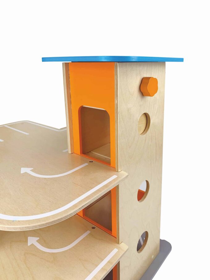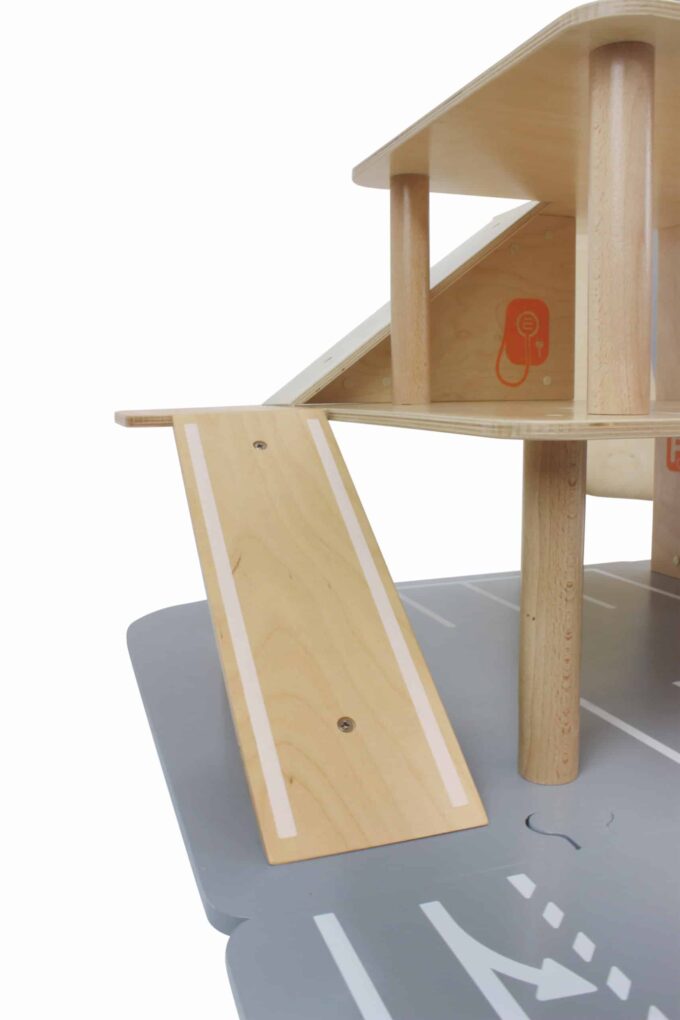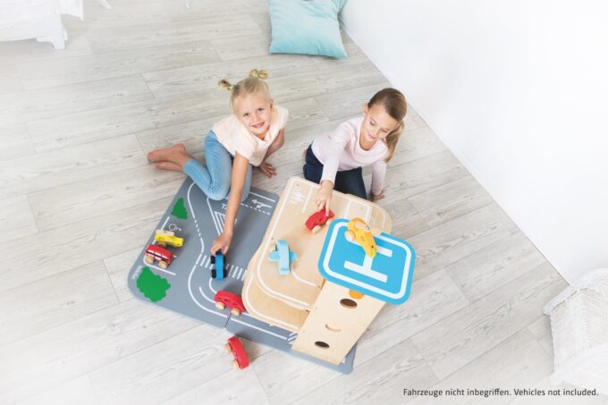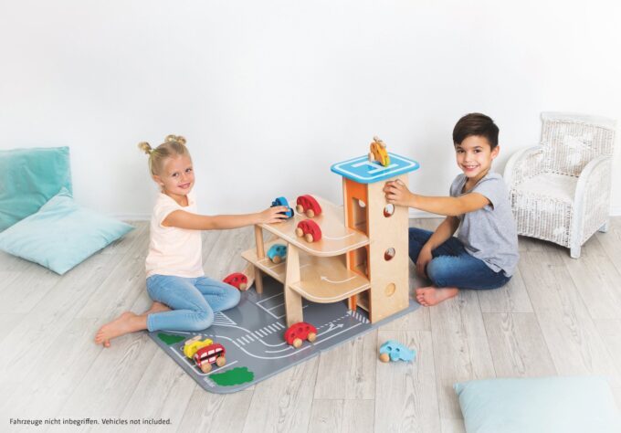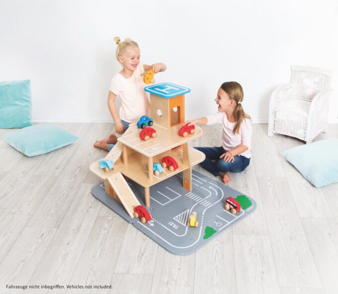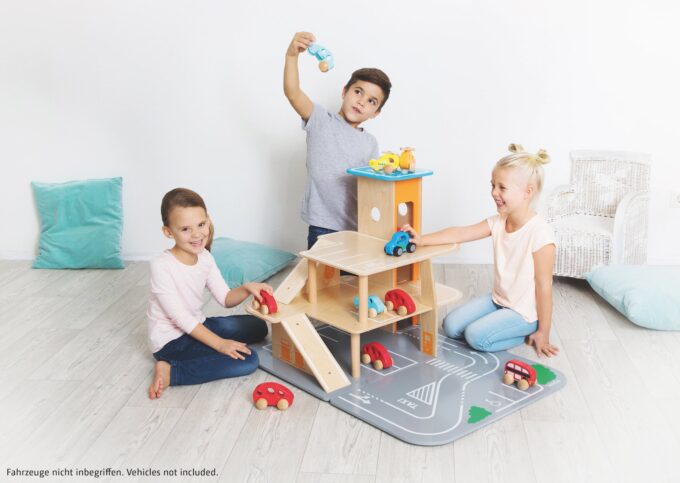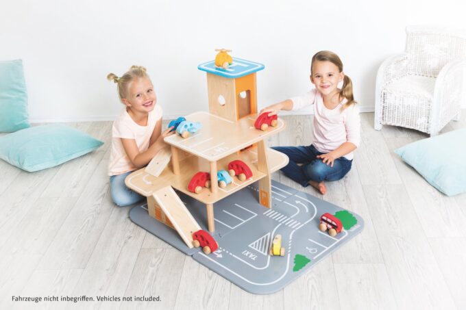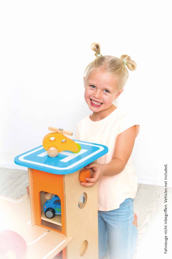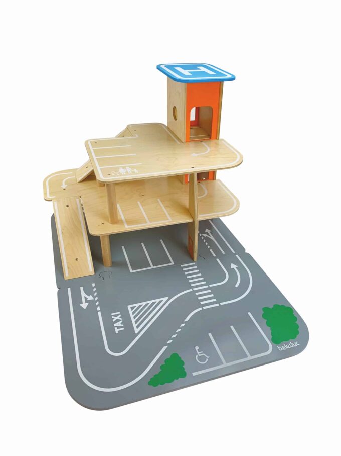 Egal ob parken, tanken, waschen, reparieren – das XXL City-Parkhaus von beleduc steckt voller Ideen und ist von allen Seiten bespielbar. Auf drei Ebenen können Autos in der Garage geparkt werden oder die Rampen in einem Rutsch hinunterflitzen oder es geht direkt von der Anfahrtsstraße auf einen der eingezeichneten Parkplätze. Der Aufzug, der über einen Seilzug bedient wird, befördert die Fahrzeuge auf die verschiedenen Parkhausebenen. Der Helikopterlandeplatz auf dem Dach des Aufzuges macht den Spielspaß komplett und die angesteckte, vordere Spielebene erhöht den Spielmehrwert und den Aktionsradius der Spielautos.