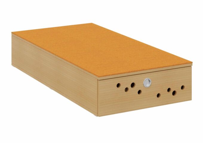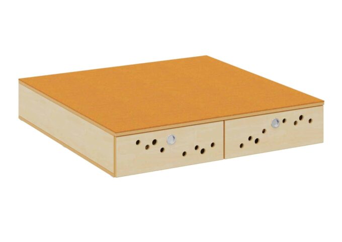 Durch die eingebauten Klappen mit Kreisfräsungen und eingelassenem Muschelgriff lassen sich die Matratzen leicht verstauen und wieder herausnehmen. Der eingelassene Klappenbeschlag, bündig mit dem Oberboden und seitlichem Magnetschnapper, sorgt für eine sichere Aufbewahrung. Die robuste Konstruktion und hochwertigen Materialien garantieren eine lange Lebensdauer.