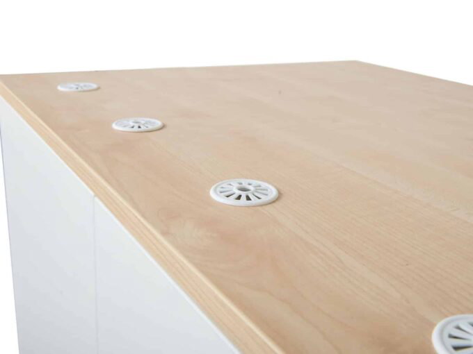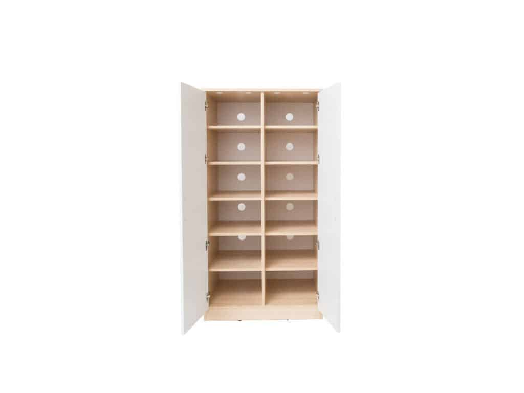 Bettzeugschrank für 12 Bettwäsche-Sets – Korpus und Türen aus 18 mm Spanplatte. Die Öffnungen im Rücken sorgen für eine natürliche Luftzirkulation.