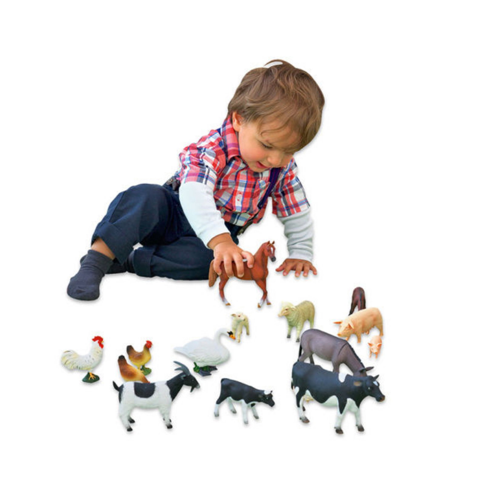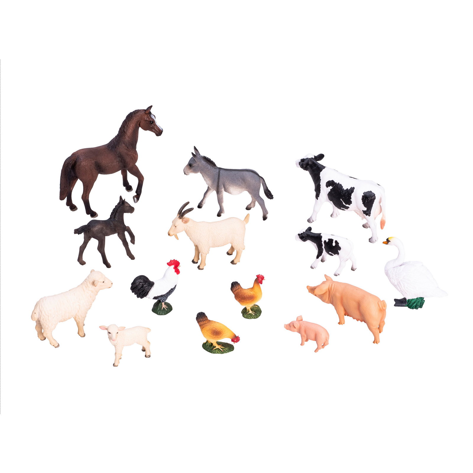- Anzahl Teile: 14 detailgetreue Tierfiguren (u.a. Pferd, Kuh, Schwein, Schaf, Henne)