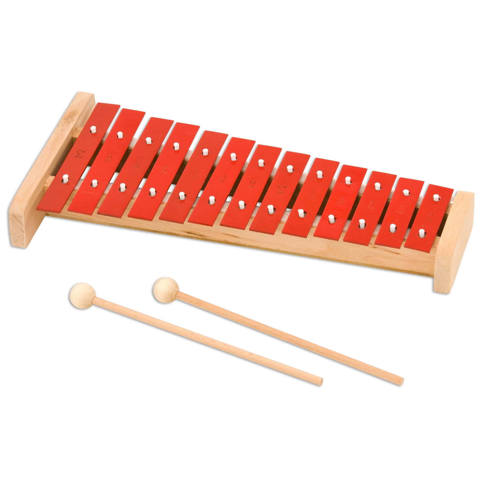 Im Lieferumfang des Glockenspiels sind 2 Holzschlägel enthalten, die perfekt auf die Metallplatten abgestimmt sind. Mit einer Länge von 21 cm und einem Kopf von Ø 2 cm liegen sie gut in der Hand und ermöglichen kontrollierte Klänge. Die solide Konstruktion des Instruments kommt mit einem Resonanzkasten, in dem sowohl die Glockenplatten als auch die Schlägel sicher gelagert werden können, wenn sie nicht in Gebrauch sind.