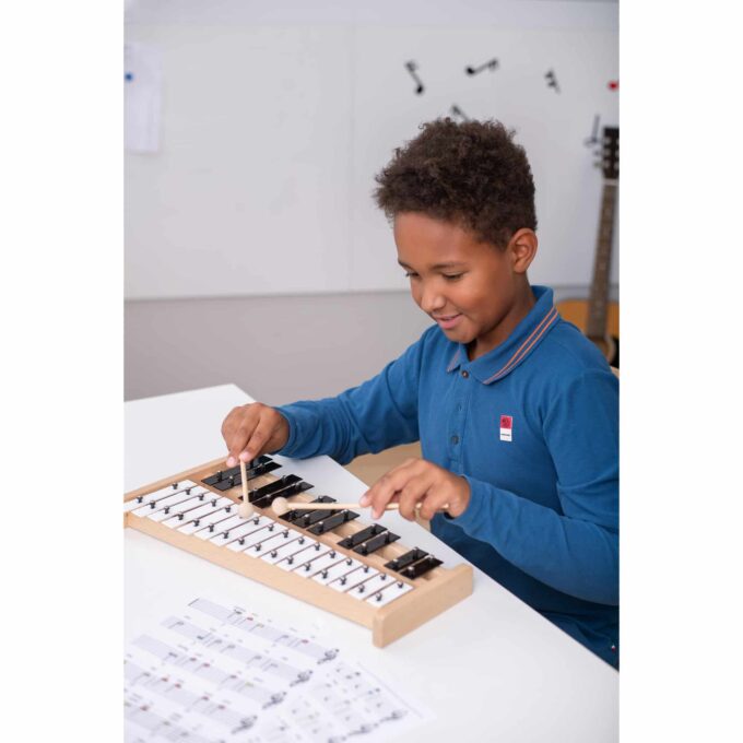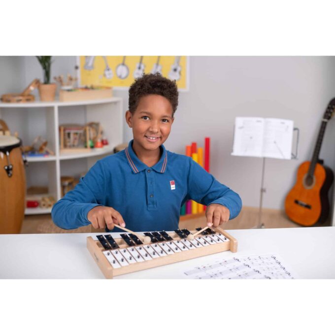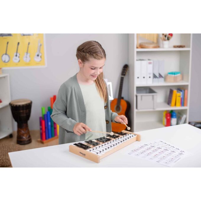 Die Farben des Glockenspiels, darunter schwarz, weiß und natur, machen es nicht nur zu einem effektiven Musikwerkzeug, sondern auch zu einem ansprechenden Gestaltungselement im Klassenraum. Gerade die Kombination aus musikalischem Lernen und visuellem Erlebnis trägt dazu bei, das Interesse der Kinder an der Musik zu wecken und zu erhalten.