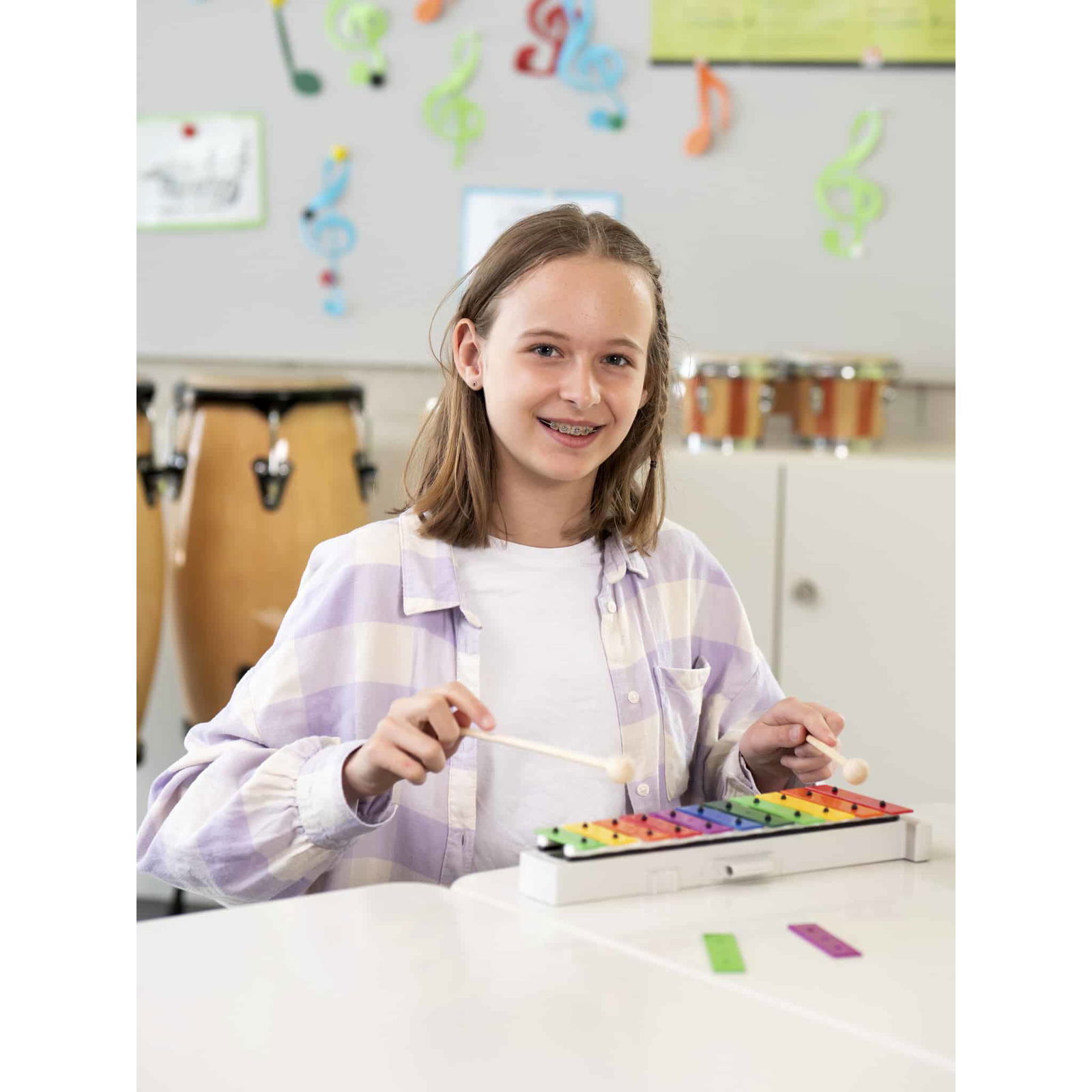 Die Klangbausteine sind nicht nur ideal, um einfache Melodien zu spielen, sondern auch zum Begleiten bekannter Lieder. Das Ausprobieren von Klangvariationen und das Erstellen eigener Melodien fördern nicht nur die Kreativität, sondern auch das Vertrauen in die musikalischen Fähigkeiten der Kinder. Das vielfältige Klangspektrum inspiriert die Schüler dazu, aktiv am Musikunterricht teilzunehmen.