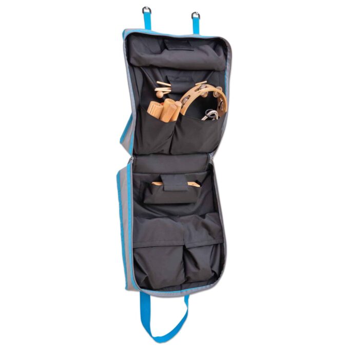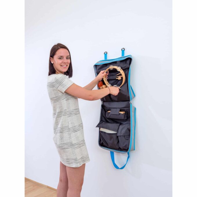 Die Rhythmik-Tasche besteht aus robustem Polyester und wurde so konzipiert, dass alle Instrumente sicher und ordentlich verstaut werden können. Mit einem verstellbaren Trageriemen lässt sich die Tasche bequem über der Schulter tragen – so haben Sie die Hände frei für andere Aktivitäten! Ideal für Lehre und Mobilität! Im Musiksaal oder Klassenzimmer kann die Tasche einfach an die Wand gehängt werden, sodass alle Kinder jederzeit darauf zugreifen können.