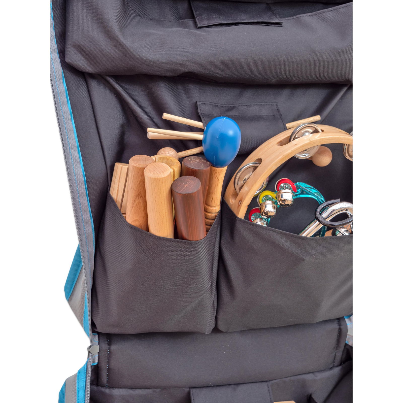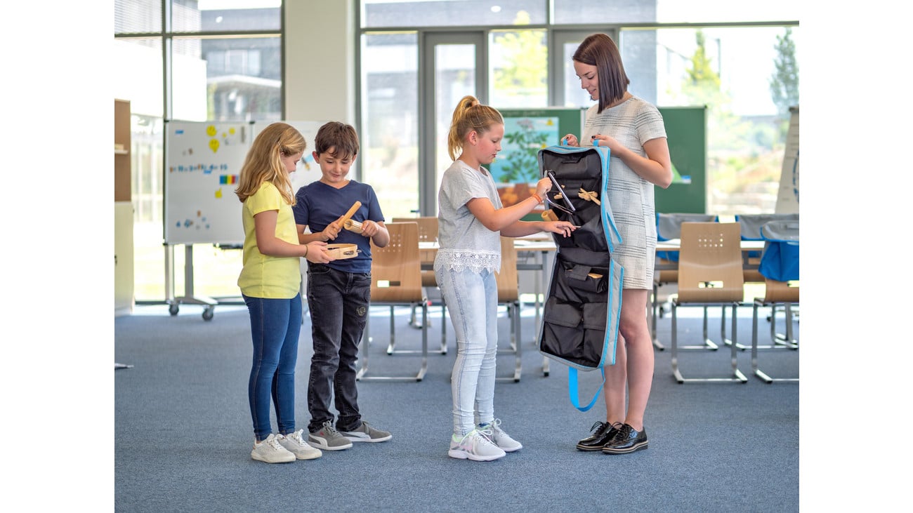 Die Möglichkeit, die Tasche an der Wand aufzuhängen, schafft zusätzlich Platz im Raum und sorgt dafür, dass alle Instrumente stets griffbereit sind. Die Kinder können selbstständig auf die Instrumente zugreifen, was ihre Unabhängigkeit und ihr kreatives Spiel fördert.