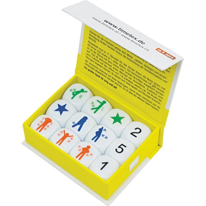 Ein Wurf genügt, und schon steht die Aufgabe fest: „Springe 5 Mal wie ein Frosch!“ oder „Kreise deine Arme 3 Mal rückwärts!“ Dieses einfache Prinzip macht die Bewegungswürfel zum idealen Werkzeug, um im Klassenzimmer, in der Kita-Gruppe oder zu Hause für frischen Schwung zu sorgen. Ganz ohne komplizierte Vorbereitung oder zusätzliche Hilfsmittel bringen die Würfel Kinder in Bewegung, steigern nachweislich die Konzentrationsfähigkeit und fördern motorische Fähigkeiten auf spielerische Weise. Geliefert wird das Set in einer hochwertigen Kartonbox mit praktischem Magnetverschluss.