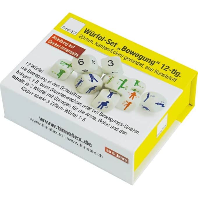 Lange Stillsitzen fällt schwer und senkt die Konzentration. Wie wäre es, wenn die nächste Bewegungspause in die Hände des Zufalls gelegt wird? Mit dem Set an Bewegungswürfeln wird jede Auflockerung zu einem spannenden Spiel. Das kompakte Set besteht aus neun Würfeln, die unzählige Übungskombinationen ermöglichen und Kinder sofort zum Mitmachen motivieren. Sechs Würfel zeigen einfache, aber effektive Übungen für Arme, Beine und den ganzen Körper, ergänzt durch Joker-Seiten für eigene Ideen. Die anderen drei Würfel bestimmen, wie oft die gewürfelte Übung wiederholt wird.