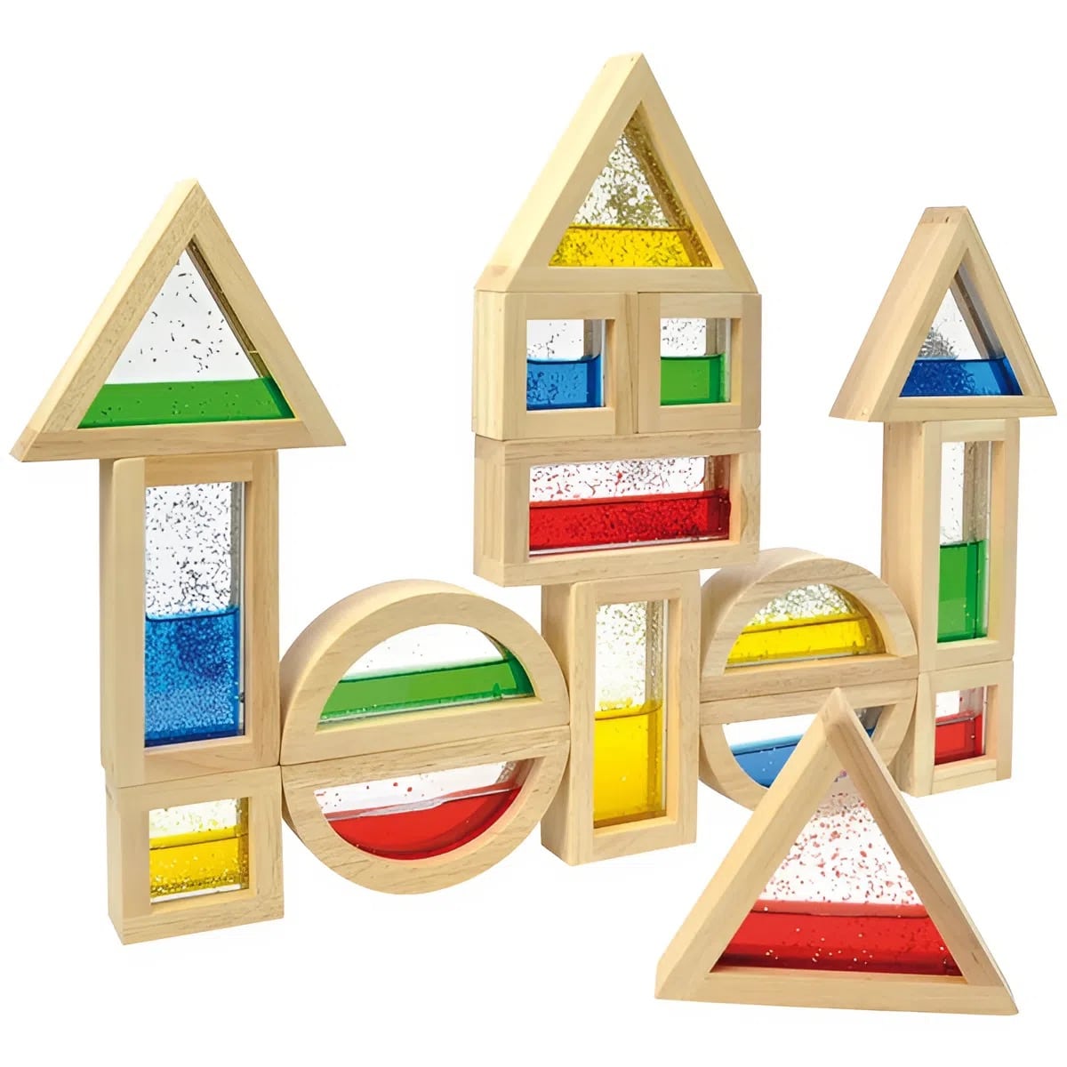 Kinder bauen hier nicht einfach nur Türme, Brücken oder Häuser. Sie erschaffen funkelnde Paläste, geheimnisvolle Schatzkammern oder galaktische Raumschiffe. Das langsame, beruhigende Spiel des Glitzers im Inneren der Steine wirkt hypnotisch und verwandelt jedes Bauwerk in ein kleines, leuchtendes Kunstwerk. Die Kombination aus warmem Holz und dem magischen Glitzerspiel regt die Fantasie an und lädt dazu ein, die Welt der Formen und des Lichts mit allen Sinnen zu erkunden.