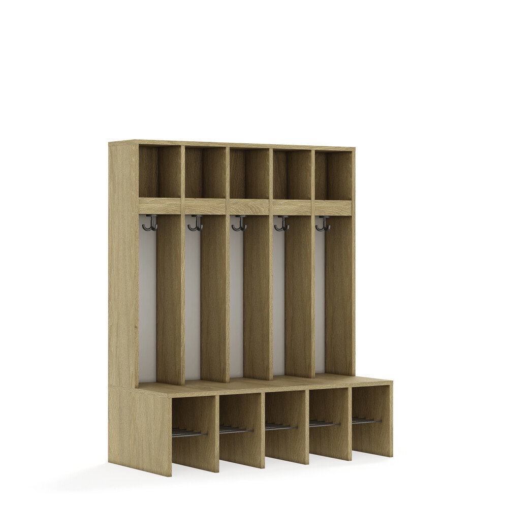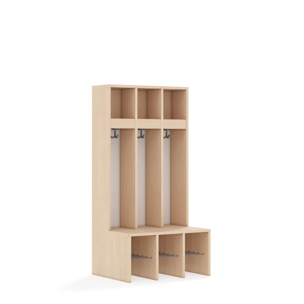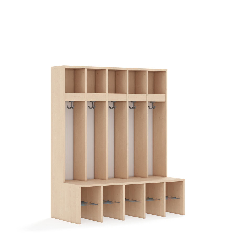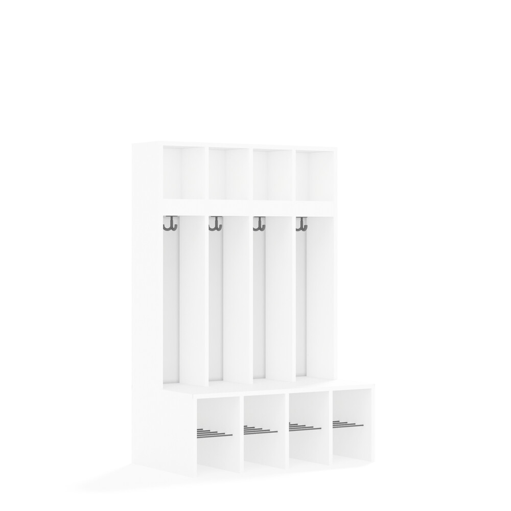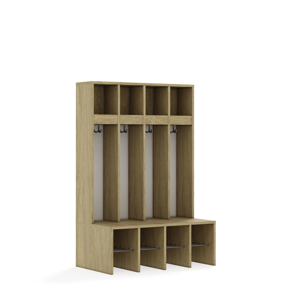Jedes Fach ist mit einem stabilen Kleiderhaken ausgestattet, der Jacken und Taschen sicher hält. Die durchgehenden Rückwände sorgen für Stabilität und verhindern, dass Gegenstände hinter die Garderobe fallen. Die offenen Fächer gewährleisten eine gute Belüftung der Kleidung. - Flexibel und anpassbar