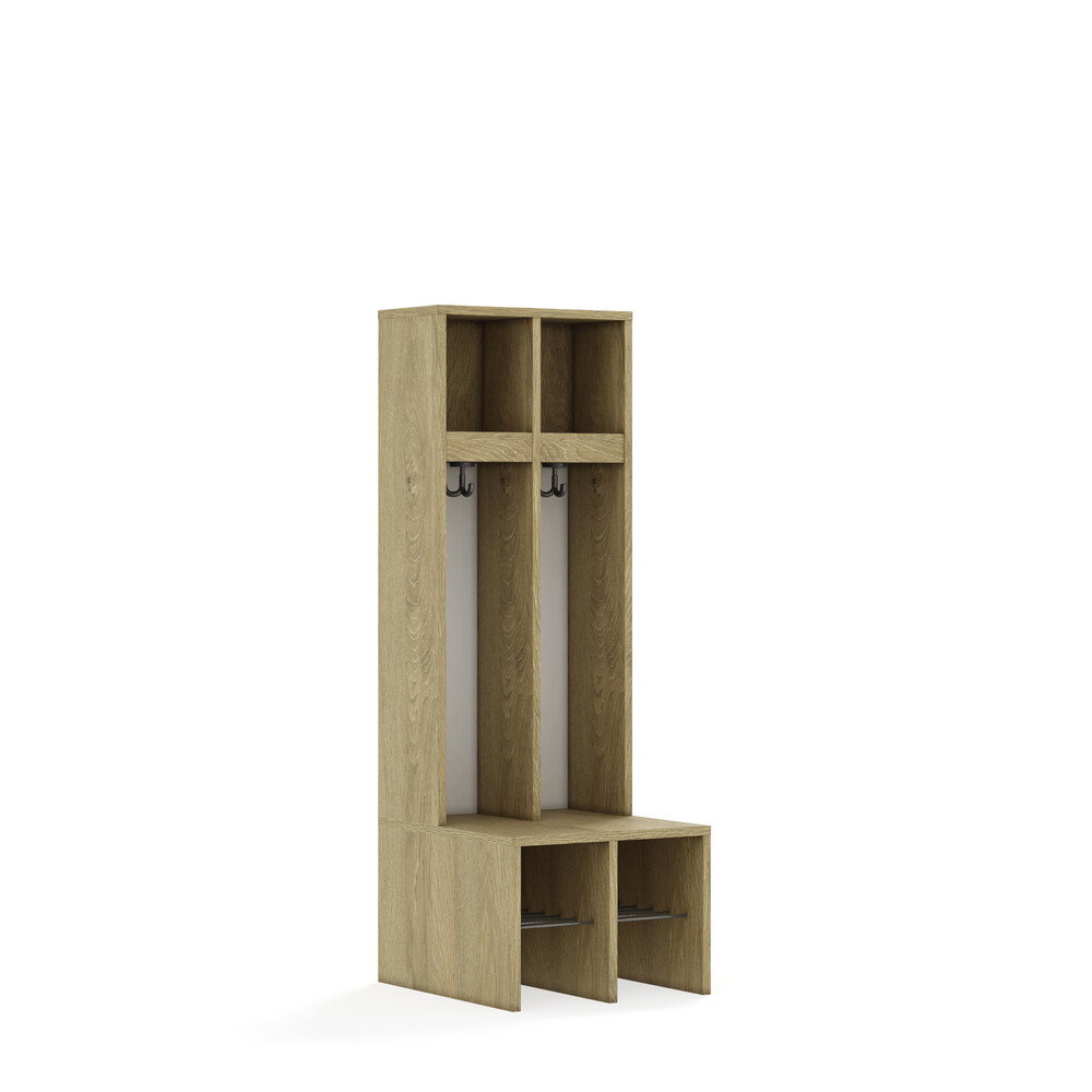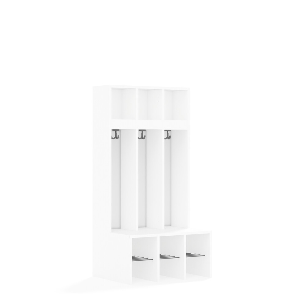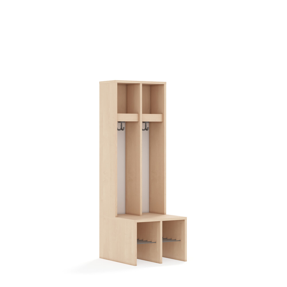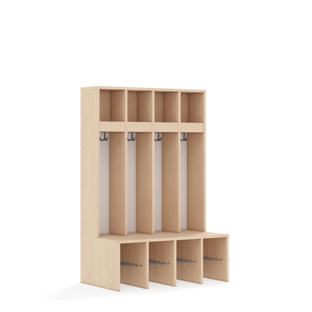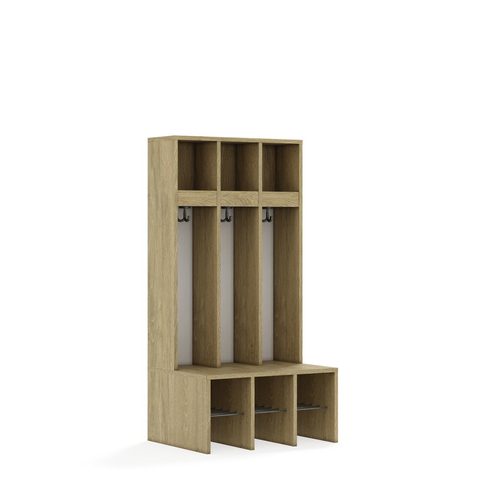 Jedes Fach ist mit einem stabilen Kleiderhaken ausgestattet, der Jacken und Taschen sicher hält. Die durchgehenden Rückwände sorgen für Stabilität und verhindern, dass Gegenstände hinter die Garderobe fallen. Die offenen Fächer gewährleisten eine gute Belüftung der Kleidung. - Flexibel und anpassbar