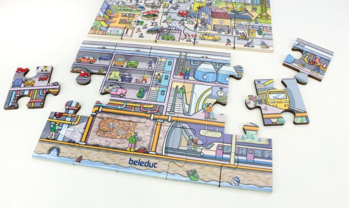 Was passiert eigentlich alles in einer großen Stadt? Wo fahren die U-Bahnen hin, wer wohnt im Hochhaus und was fliegt da oben am Himmel? Mit dem Bodenpuzzle „Stadtleben“ gehen Kinder ab drei Jahren auf eine spannende Entdeckungsreise durch den urbanen Dschungel. Dieses außergewöhnliche Puzzle ist nicht nur ein Legespiel, sondern ein riesiges Wimmelbild, das Geschichten erzählt. Es besteht aus drei separaten Puzzles, die übereinandergelegt ein beeindruckendes Gesamtbild ergeben: Vom tiefen Untergrund über das wuselige Stadtzentrum bis hinauf in den wolkenverhangenen Himmel.