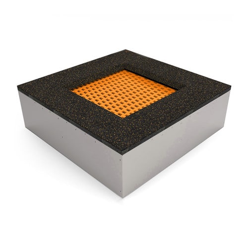 Umrandung aus 4 cm starkem EPDM-/SBR-Fallschutzmaterial. Dadurch werden eventuelle Stürze abgedämpt und gleichzeitig die Federn verdeckt.