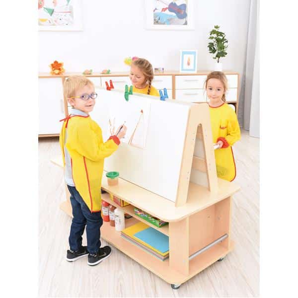 Ideales Möbelstück für die Kreativecke; mobiler Arbeitsplatz und Aufbewahrungsschrank zugleich. Bietet beste Bedingungen für die Entfaltung der kindlichen Kreativität. Mit breiten Staffeleien auf beiden Seiten – so können mehrere Kinder gleichzeitig arbeiten. Die Malutensilien sind in den Schrankfächern immer griffbereit und auch schnell wieder verstaut. In die Schrankfächer passen unsere Holzbehälter (126043, 126044, 126052 – 126063 separat zu bestellen).