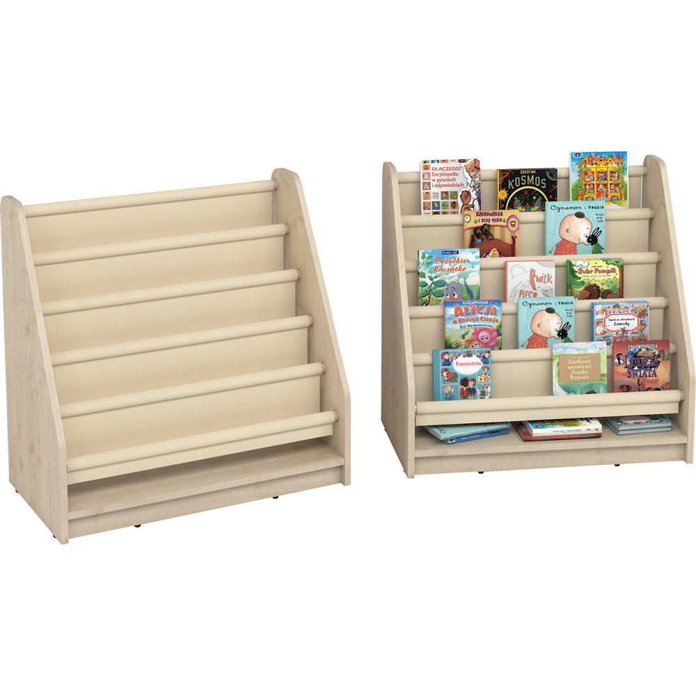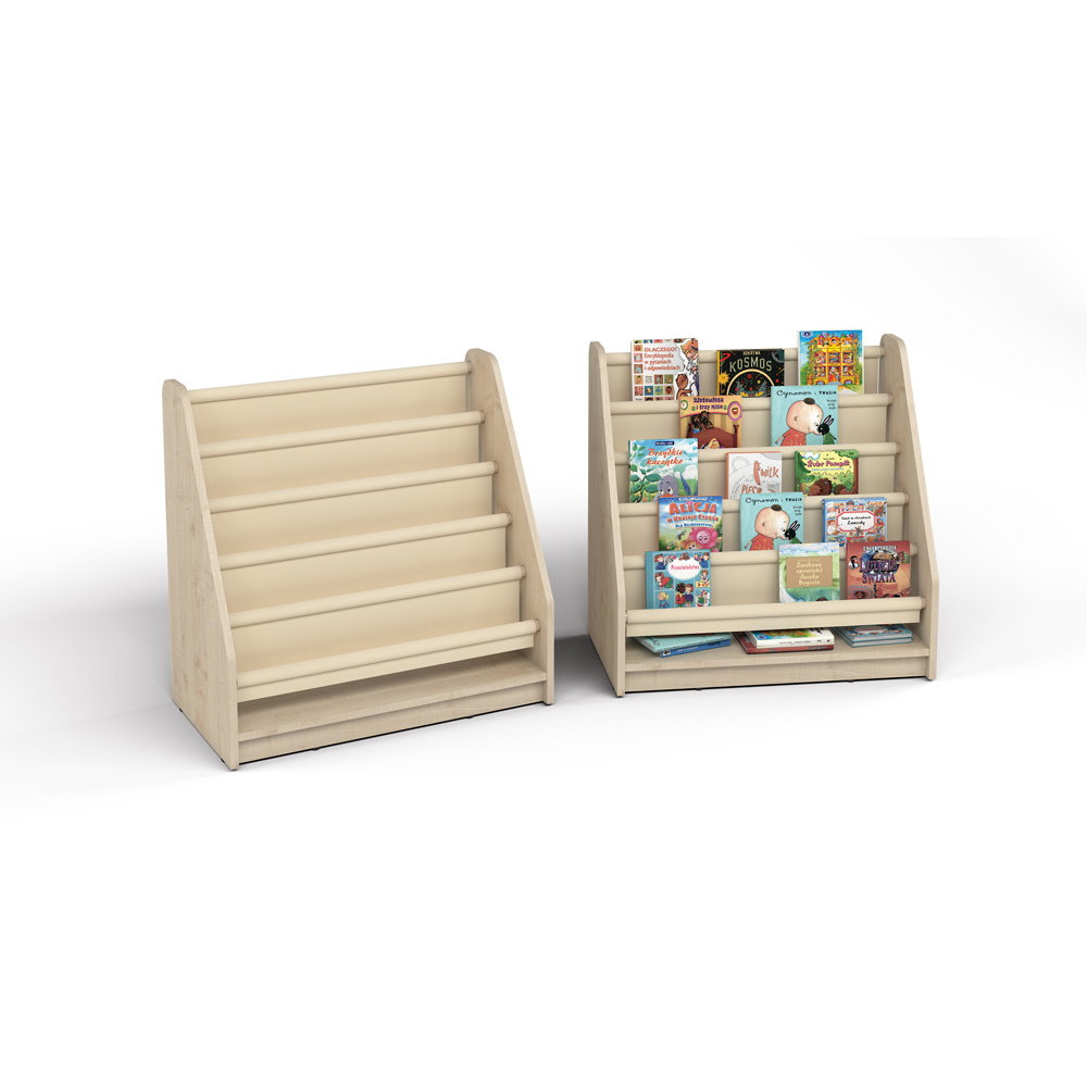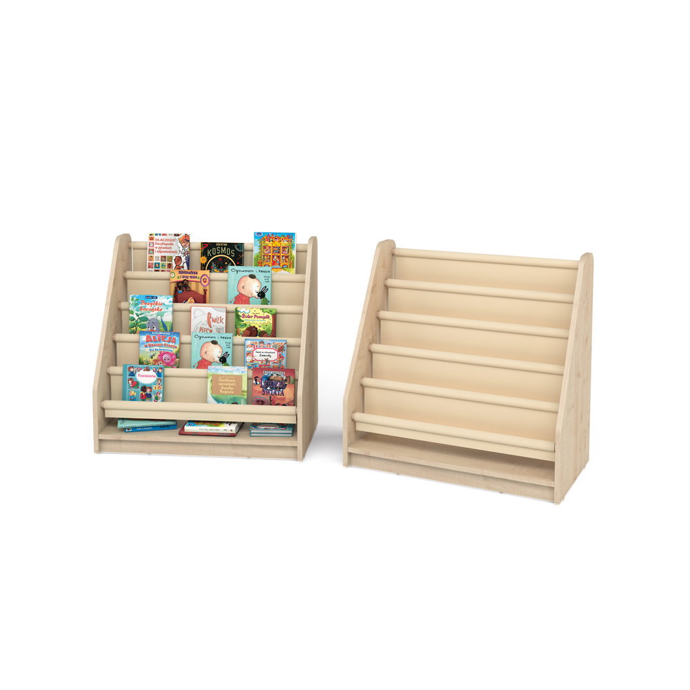 Bücherauslage Jonny (80x45x80cm) in Ahorn-Optik: Modernes Kinderregal mit waschbaren Stofffächern für frontale Buchpräsentation. Robust & hygienisch.