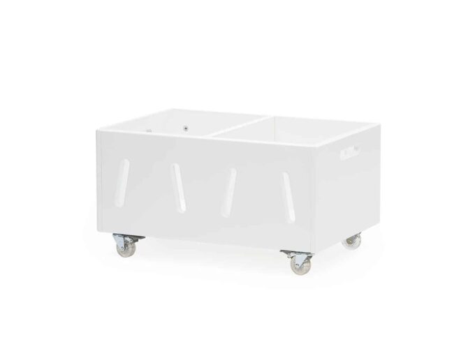Bücherregal aus 16 mm MDF, weiß lackiert, ausgestattet mit 2 Rollen mit Bremse, 2 Rollen ohne Bremse.