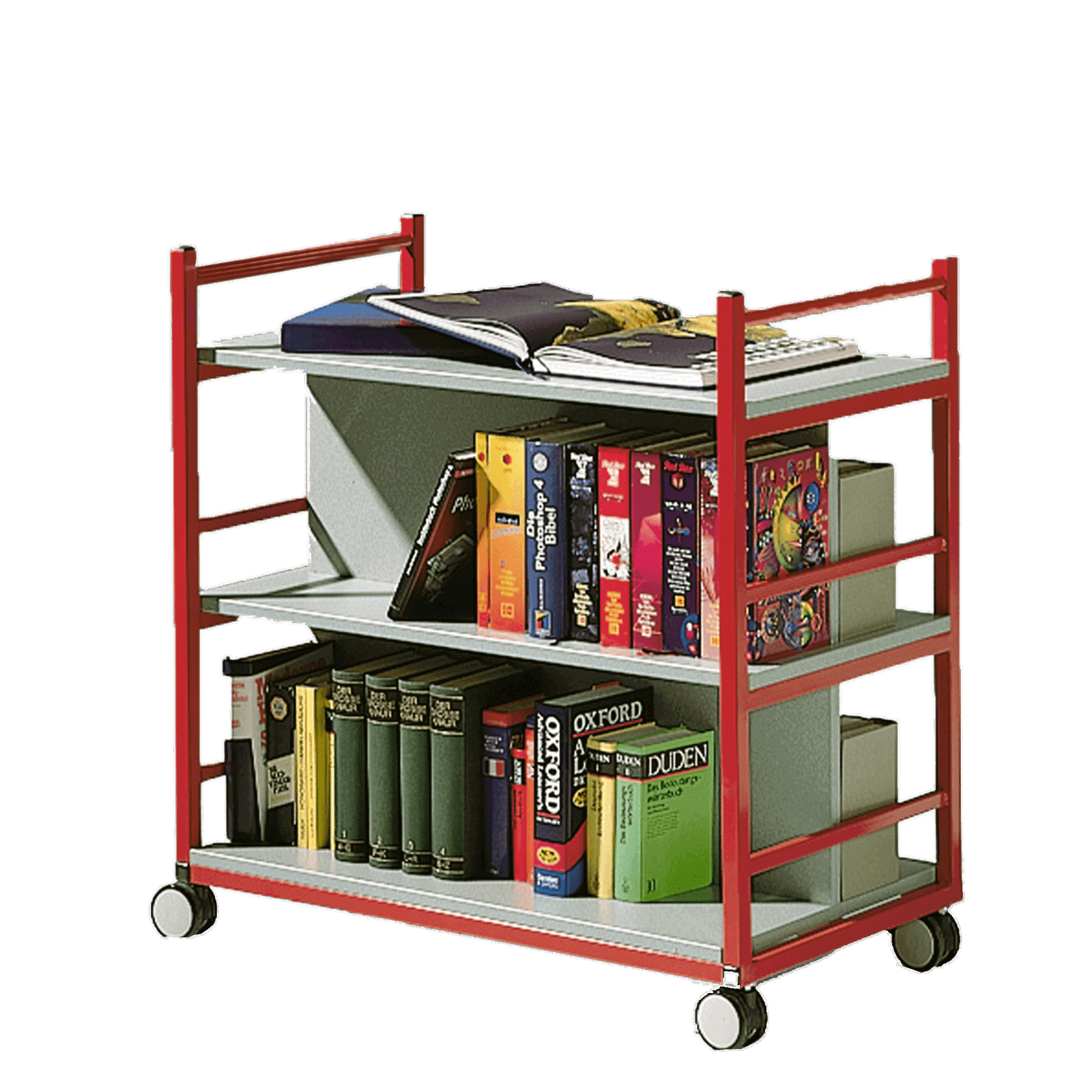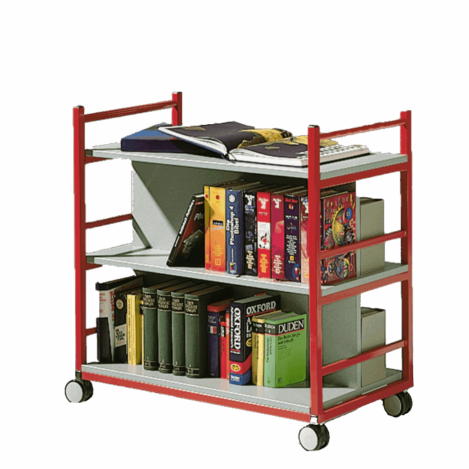 Der Bücherwagen kann beidseitig auf den jeweils 25 cm tiefen Ebenen bestückt werden, die durch eine Mittelwand getrennt sind und lässt sich dank seiner vier Rollen (davon zwei feststellbar) an jeden beliebigen Ort verschieben. Die oberste Fläche dient dabei als Ablage.
