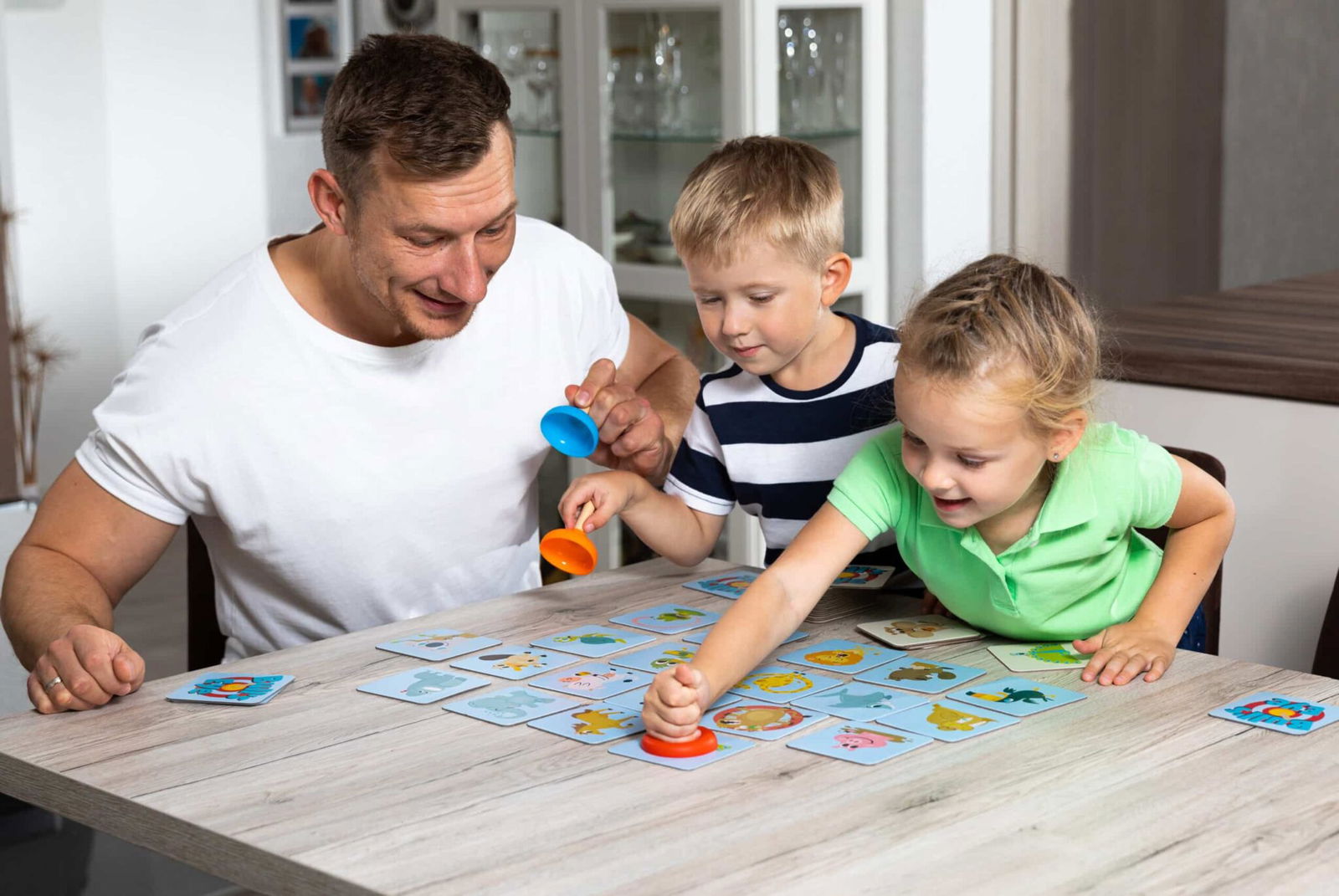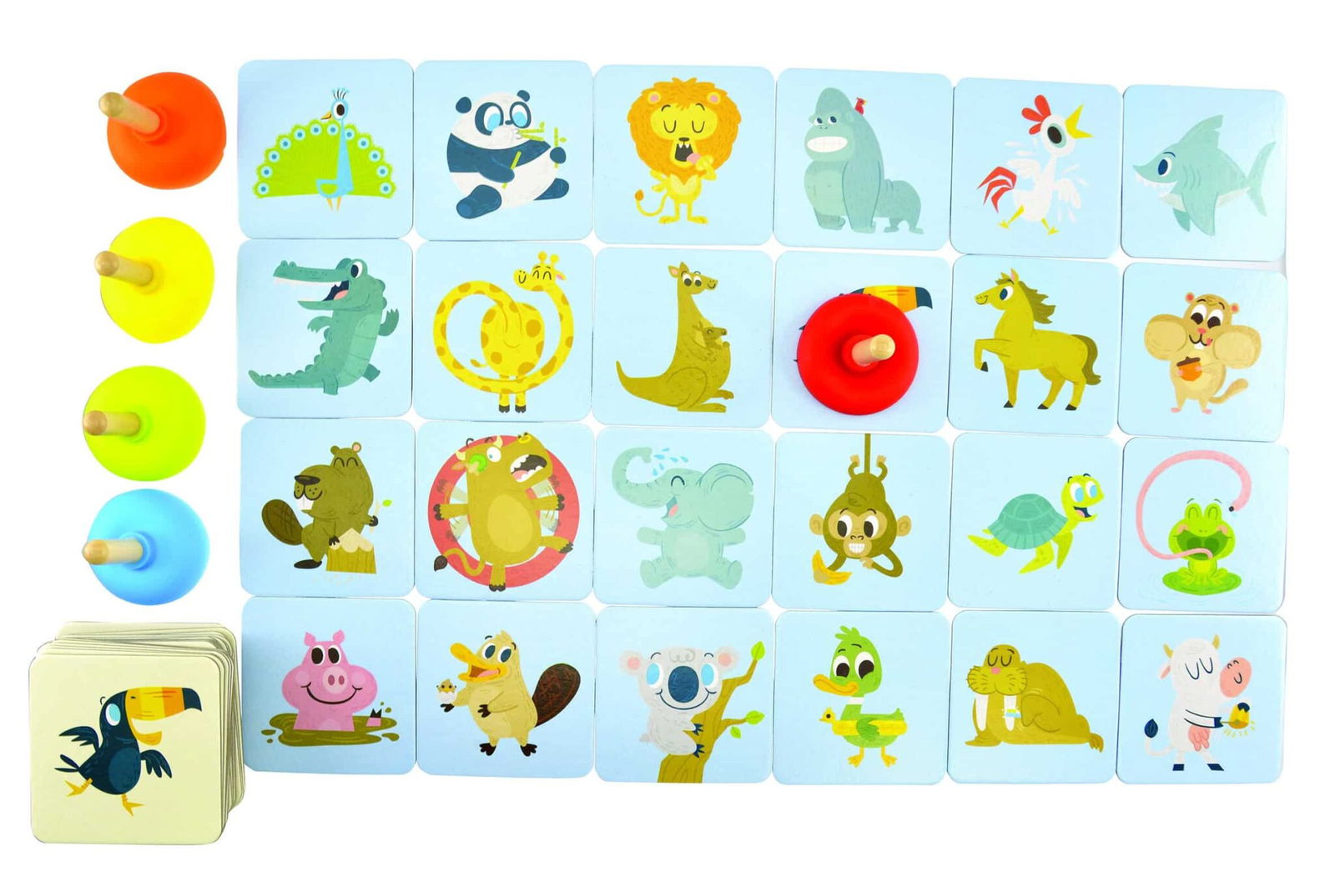 Im Bull’s Eye Spiel zeigen die Kinder ihr Geschick, indem sie schnell und genau arbeiten, um Tierpaare zu finden. Jeder Spieler erhält einen Pümpel, bereit, um die Karten zu fangen. Die blauen Karten mit den abgebildeten Tieren werden in einem 6×4 Raster aufgedeckt, während die weißen Karten verdeckt danebenliegen. Hier beginnt der Spaß!