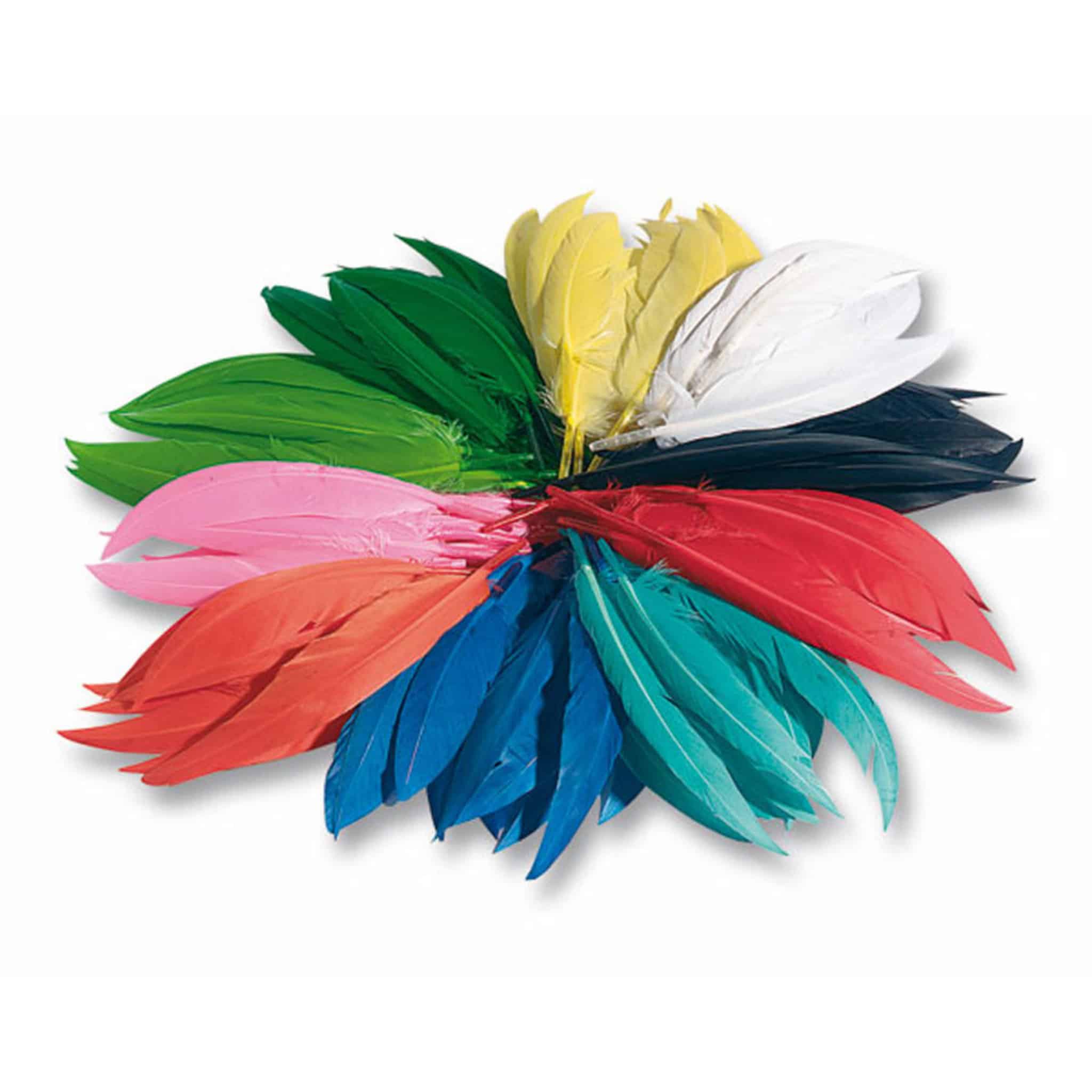 - Rund 550 bunt gemischte Gänsefedern in leuchtenden Farben bieten ideale Voraussetzungen für individuelle Bastelprojekte.
