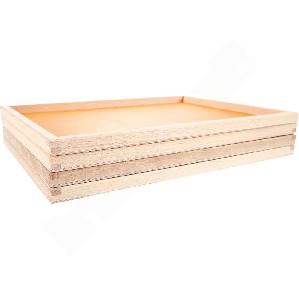 Mit einer Größe von 32 x 23 x 1,5 cm sind die 4 Tabletts ideal für die kreative Nutzung von Materialien wie Sand oder Spielsalz (Artikelnummern 451135 und 451172, separat bestellbar). Beim Gestalten und Spielen mit den verschiedenen Materialien können Kinder spielerisch ihre Fingerfertigkeit trainieren, was eine wichtige Grundlage für das spätere Schreibenlernen darstellt.