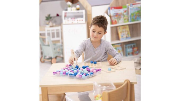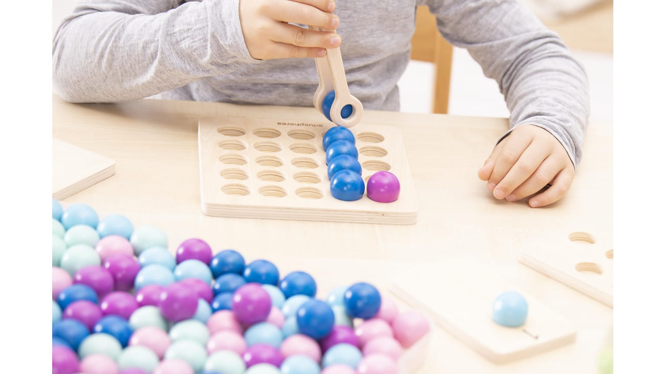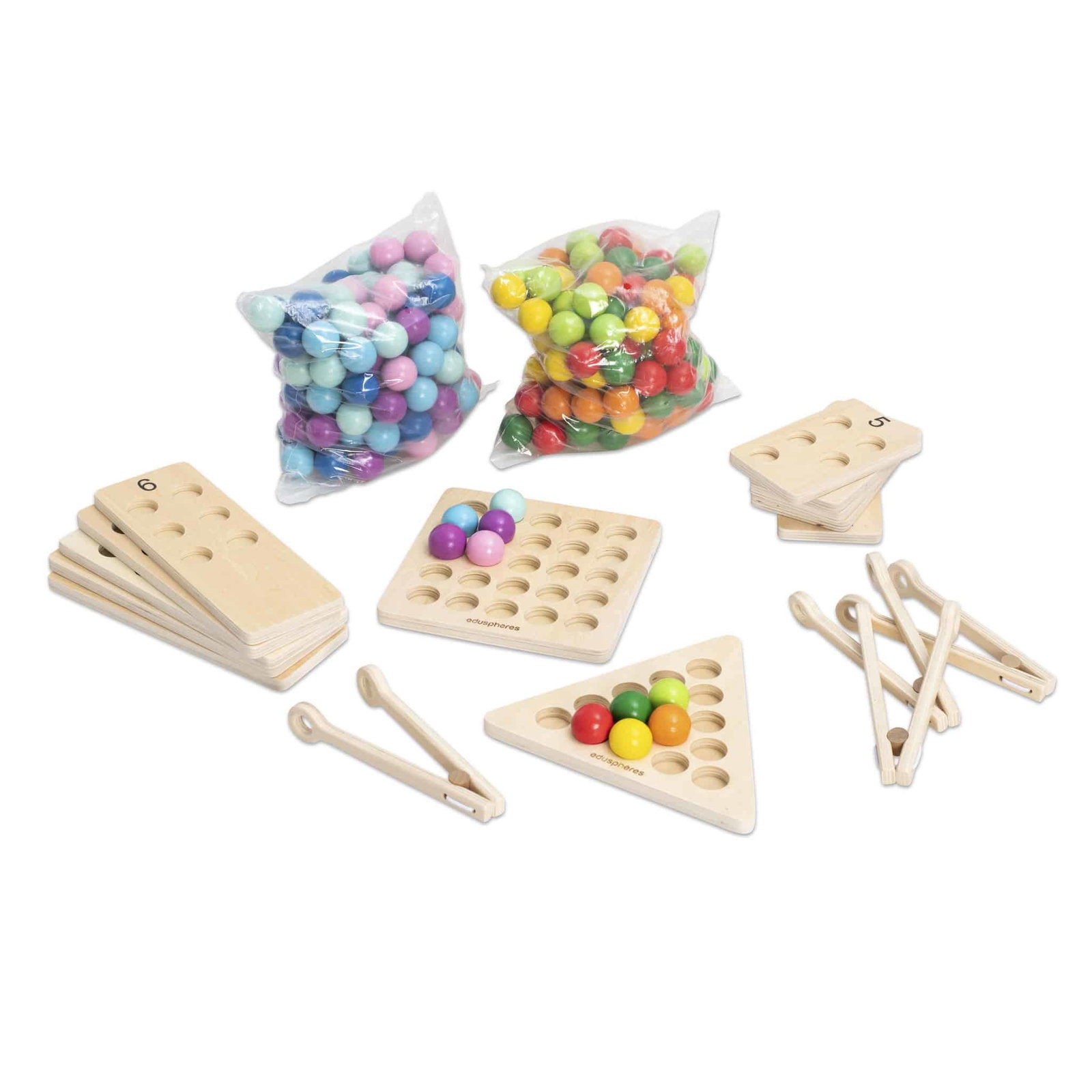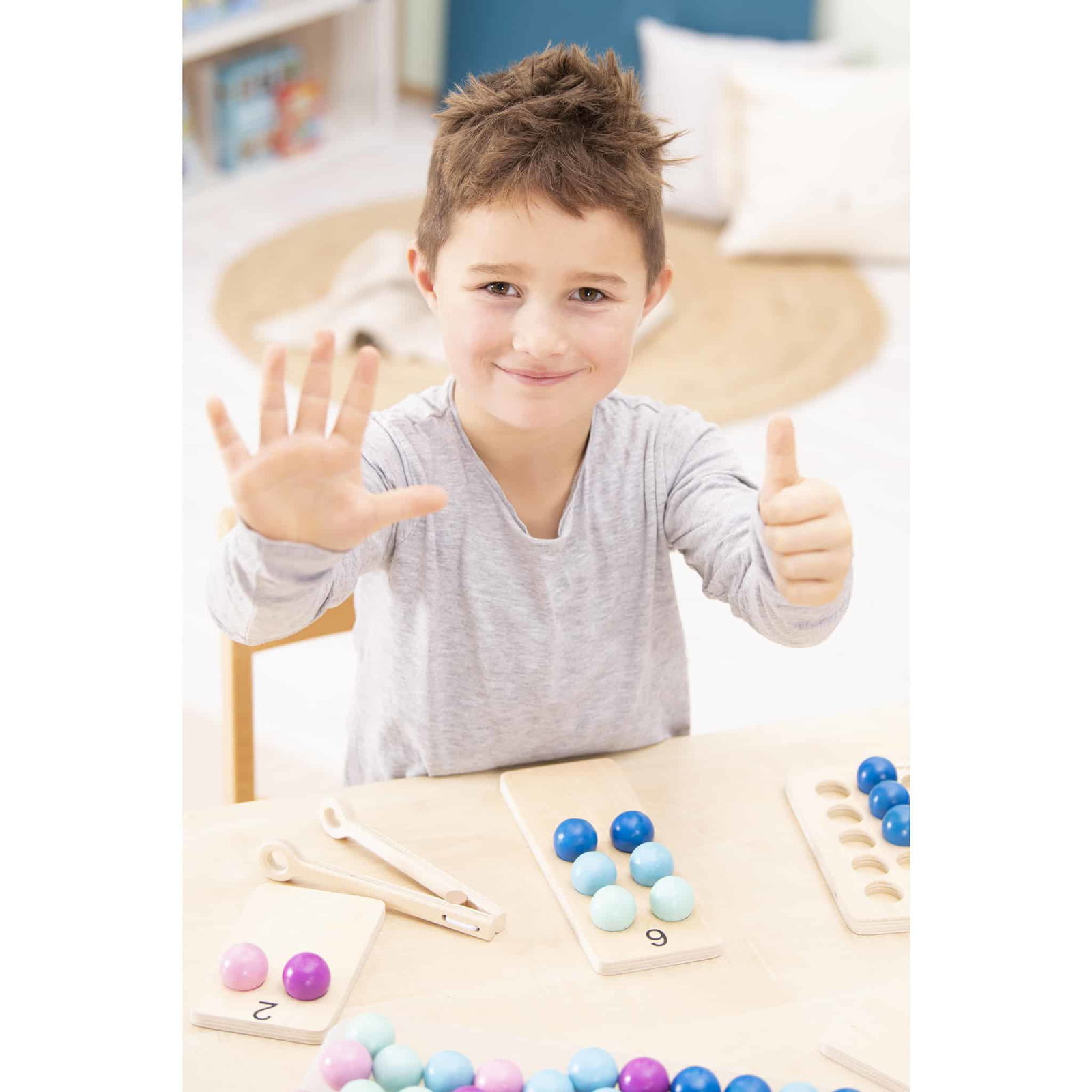 Das Zähl- und Motorik-Set eignet sich hervorragend zur Unterstützung des Lernens in der Vorschule und im Kindergarten. Kinder trainieren beim Greifen der bunten Kugeln mit den hölzernen Greifzangen ihre Feinmotorik intensiv. Die handlichen Zangen ermöglichen es den Kindern, die Kugeln auf die passenden Zähltafeln zu legen und fördert gleichzeitig die Koordination.
