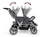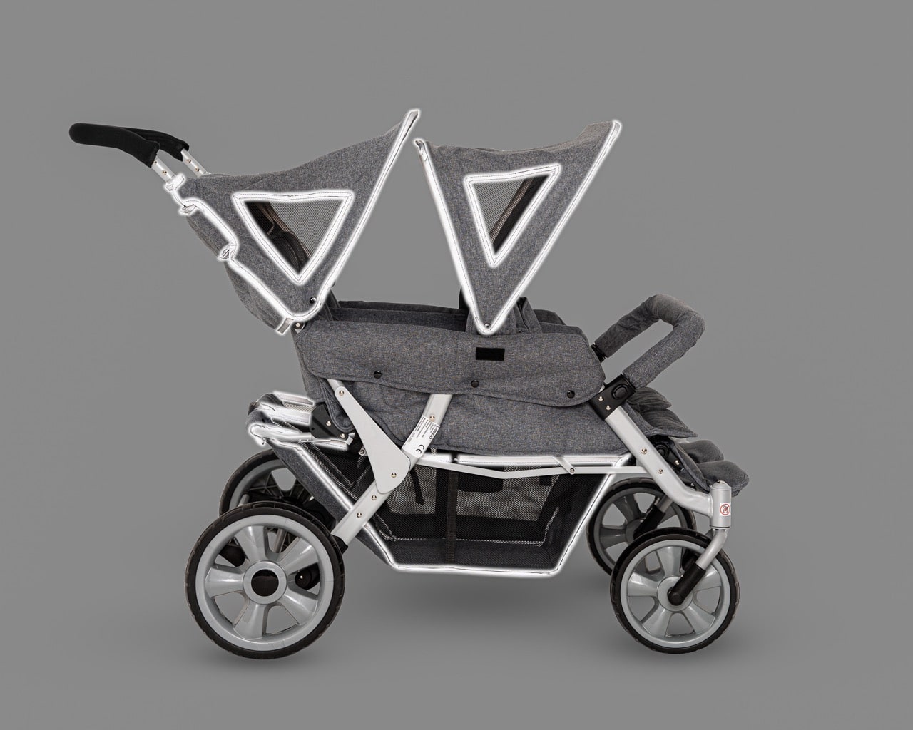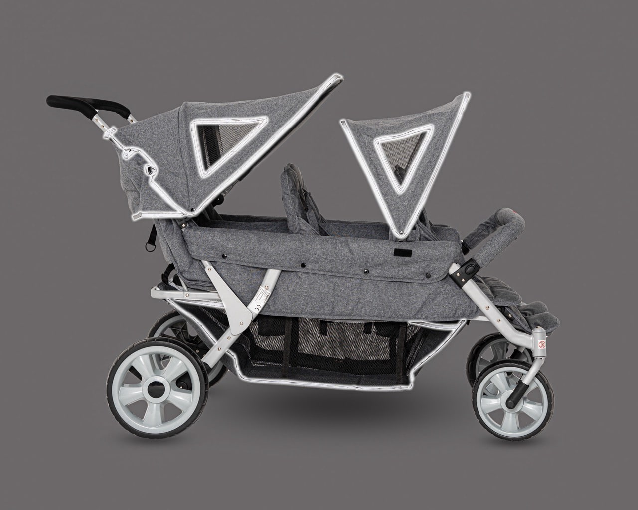 Der Cabrio Krippenwagen 4-Sitzer bietet zudem erhöhten Schutz bei schlechten Lichtverhältnissen. Die integrierten Reflektorstreifen an den Sonnendächern und am Stauraum sorgen dafür, dass Sie bei Dämmerung und Dunkelheit gut sichtbar sind.