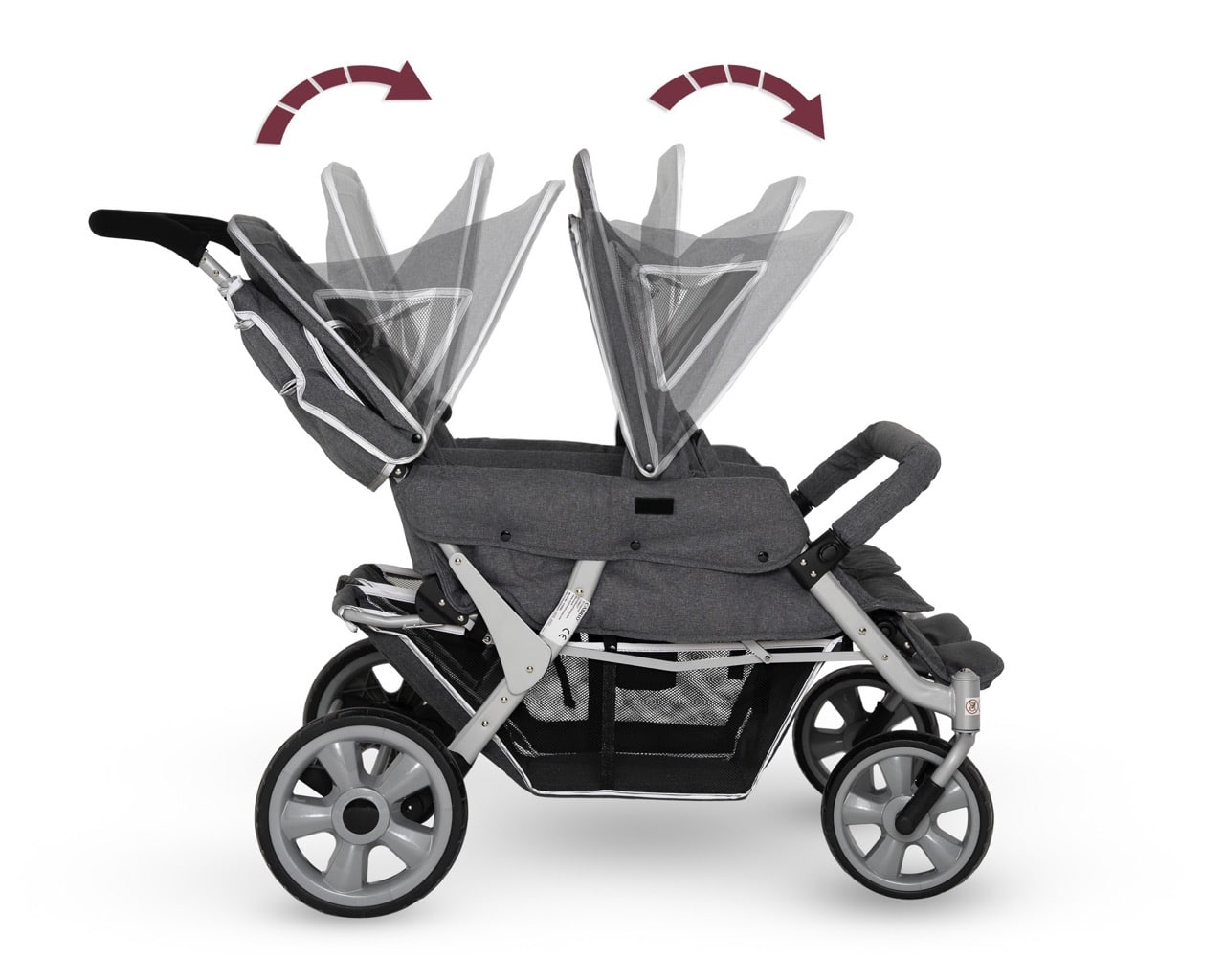 - Abnehmbare Sonnendächer: Die verstellbaren und abnehmbaren Dächlein bieten optimalen Schutz bei unterschiedlichsten Wetterbedingungen.