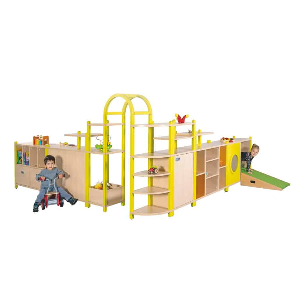 Verwandeln Sie jeden Gruppenraum in eine aufregende Welt voller Geheimnisse, Spielanreize und perfekter Ordnung. Das Regalsystem „CLAUDIA“ ist mehr als nur ein Raumteiler – es ist eine durchdachte Abenteuerlandschaft, die speziell für die Bedürfnisse neugieriger Kinder in Kitas und Schulen entwickelt wurde. Als umfassende Ecklösung kombiniert dieses achteilige System auf geniale Weise geheime Verstecke, interaktive Spielelemente wie einen Durchkrabbelschrank mit Bullauge und eine Fülle an cleverem Stauraum. „CLAUDIA“ schafft eine Umgebung, die die Fantasie beflügelt, zum Entdecken einlädt und gleichzeitig eine klare, kindgerechte Struktur in den Raum bringt.