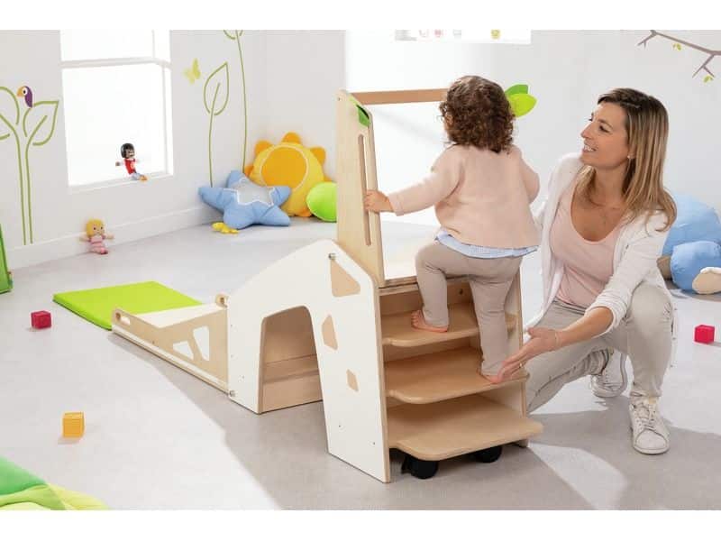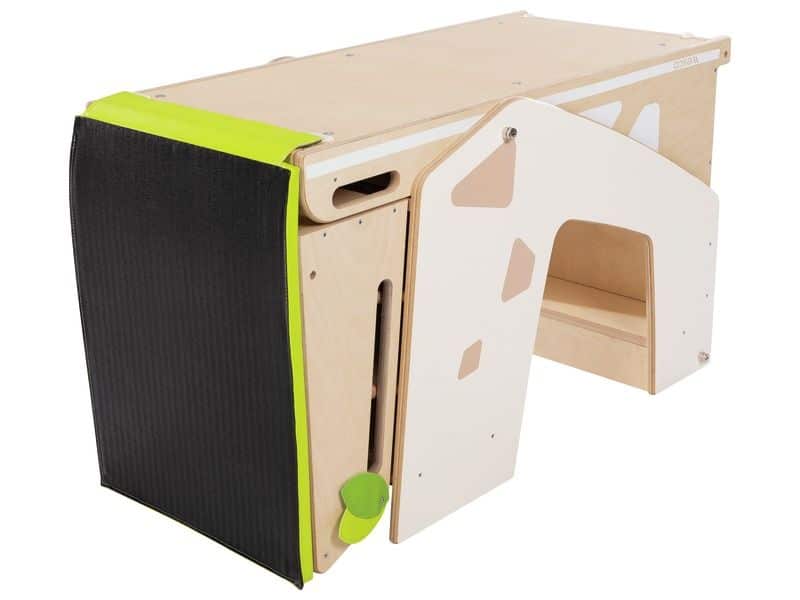 Die CLIMB Rutsche bietet vielseitige Aktivitäten: Klettern, Rutschen und Versteckspielen – alles sicher unter der Aufsicht eines Erwachsenen. Durch ihr kompaktes und mobiles Design lässt sie sich leicht zusammenklappen und dank des Rollsystems bequem verschieben. Ein Highlight ist der integrierte Spiegel in der Passage, der zusätzliche Entdeckungsmöglichkeiten bietet.
