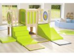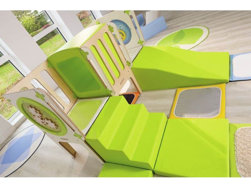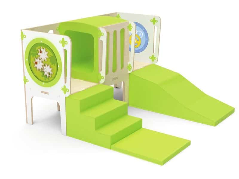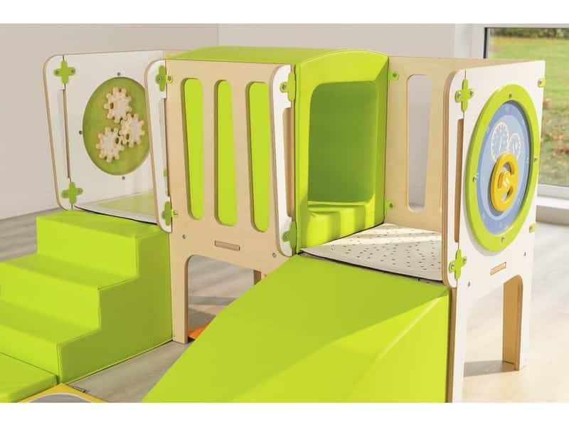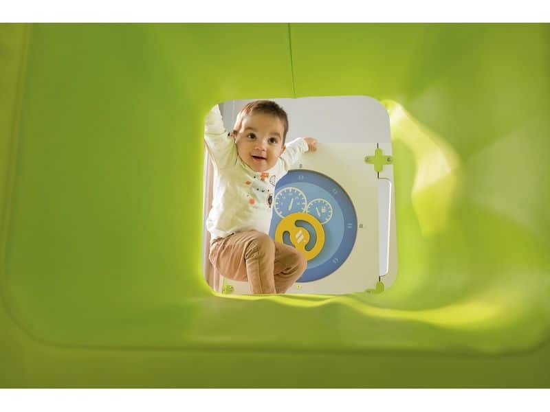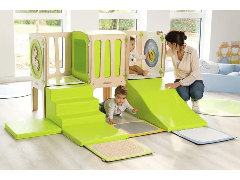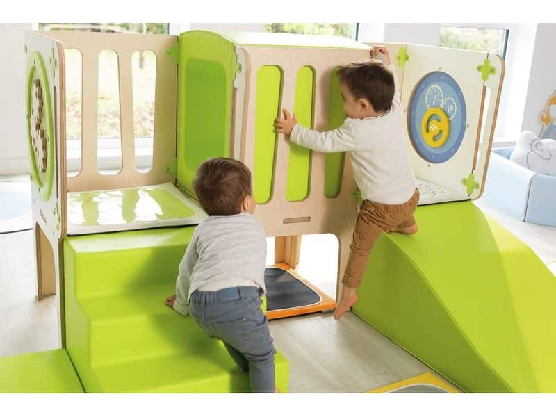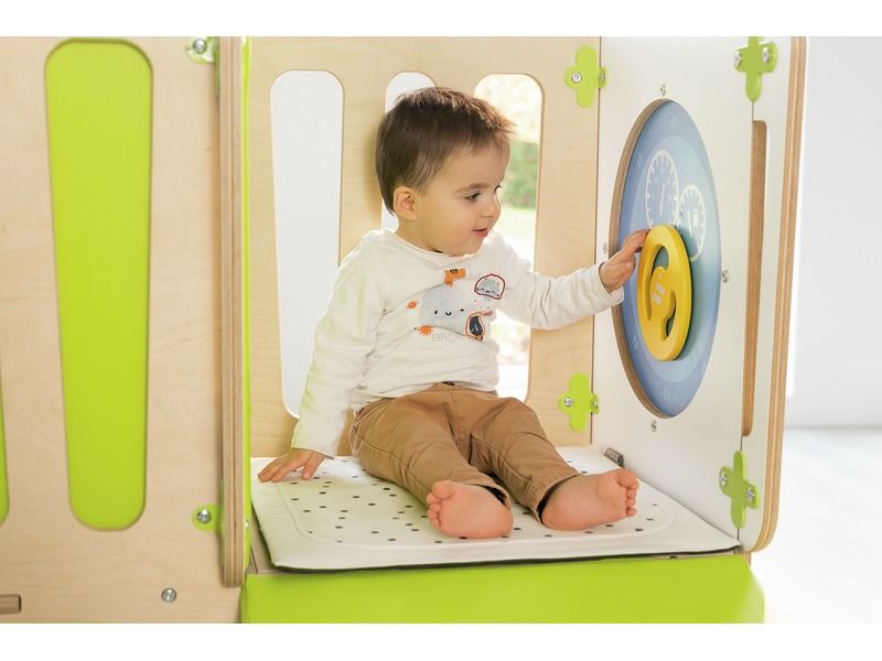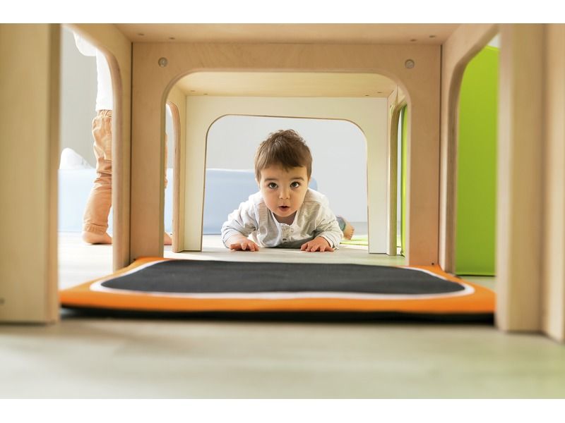 Mit dem CLIMBaby Durchgang können Kinder sicher und spielerisch ihre motorischen Fähigkeiten entwickeln. Sie können klettern, rutschen und krabbeln, während sie spannende Abenteuer erleben. Die Struktur bietet einen Tunnel für Versteckspiele sowie eine schräge Schaumstofffläche und Treppen, die das Risikoempfinden der Kinder schärfen. Die integrierten Spieltafeln Alvéole (Auto, Zahnräder) fördern zudem die Hand-Augen-Koordination.