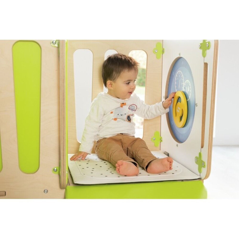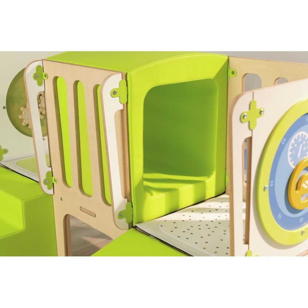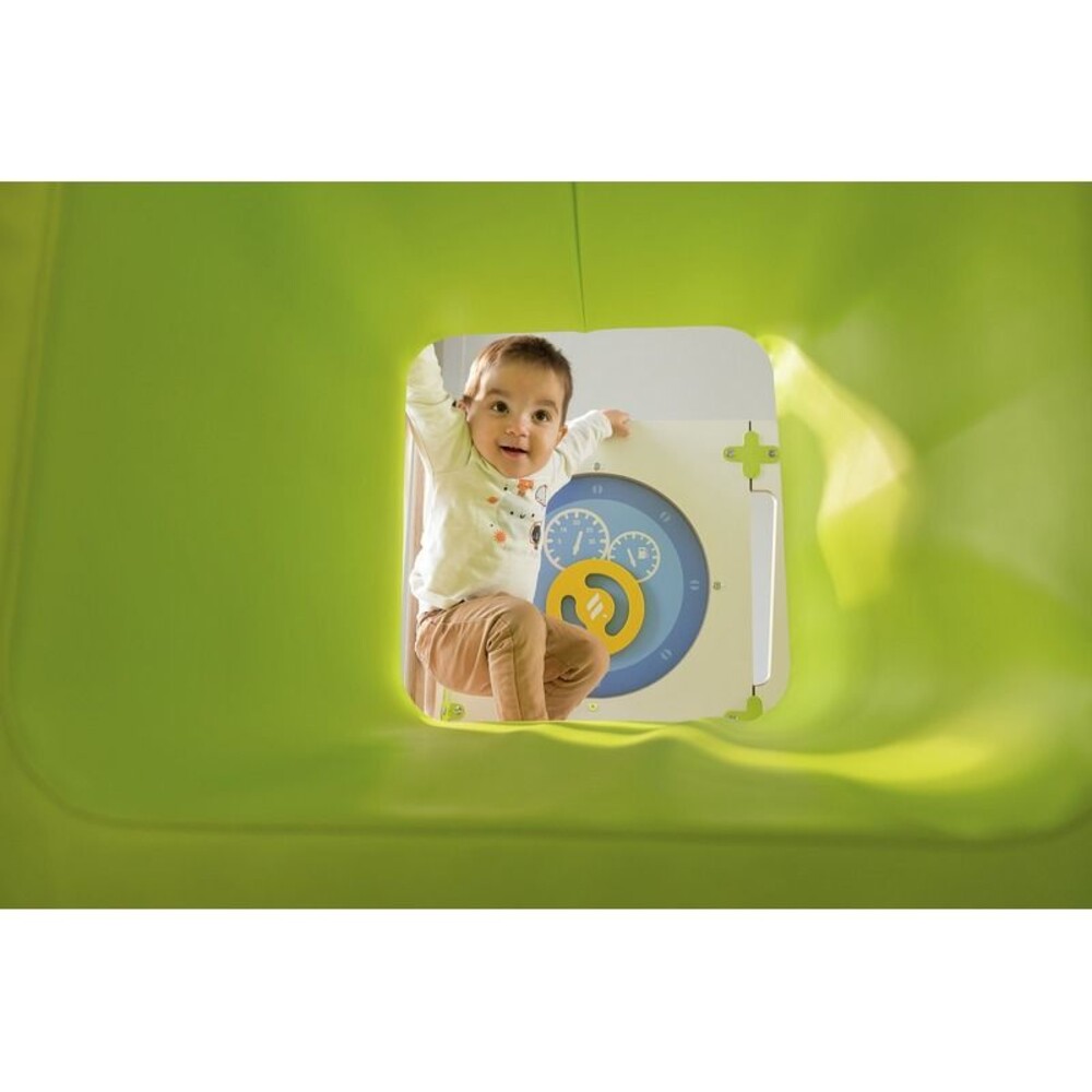 - Kognitive Entwicklung durch interaktive ElementeZusätzlich zur grobmotorischen Bewegung fördert die Struktur die Feinmotorik. Die integrierten Alvéole-Spieltafeln, ausgestattet mit einem kleinen Auto und drehbaren Zahnrädern, fordern die Kinder heraus und trainieren die wichtige Hand-Augen-Koordination konzentriert und spielerisch.