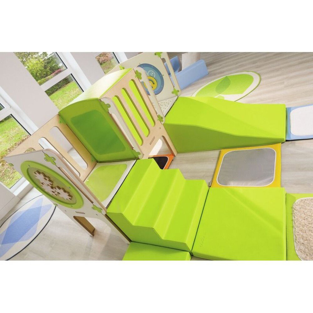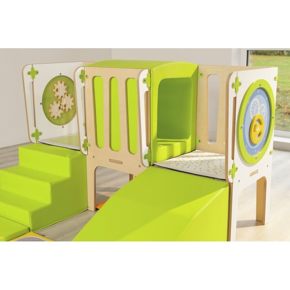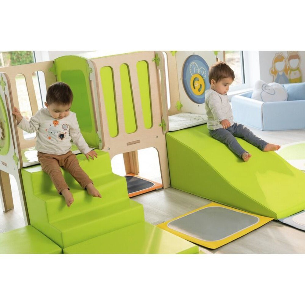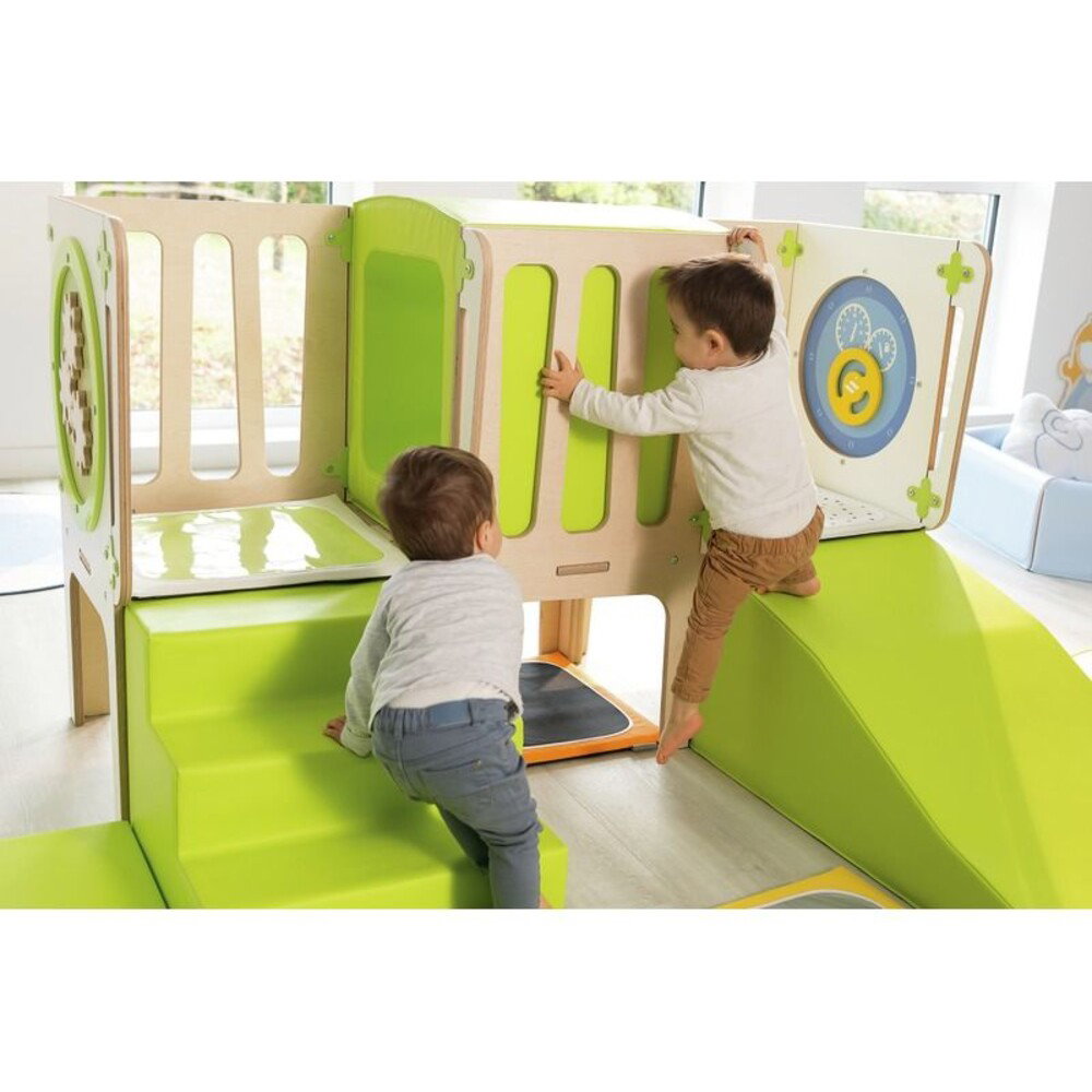 - Pädagogische Elemente: Tunnel, Schaumstoffschräge, Treppe, Spieltafeln Alvéole (Auto, Zahnräder)