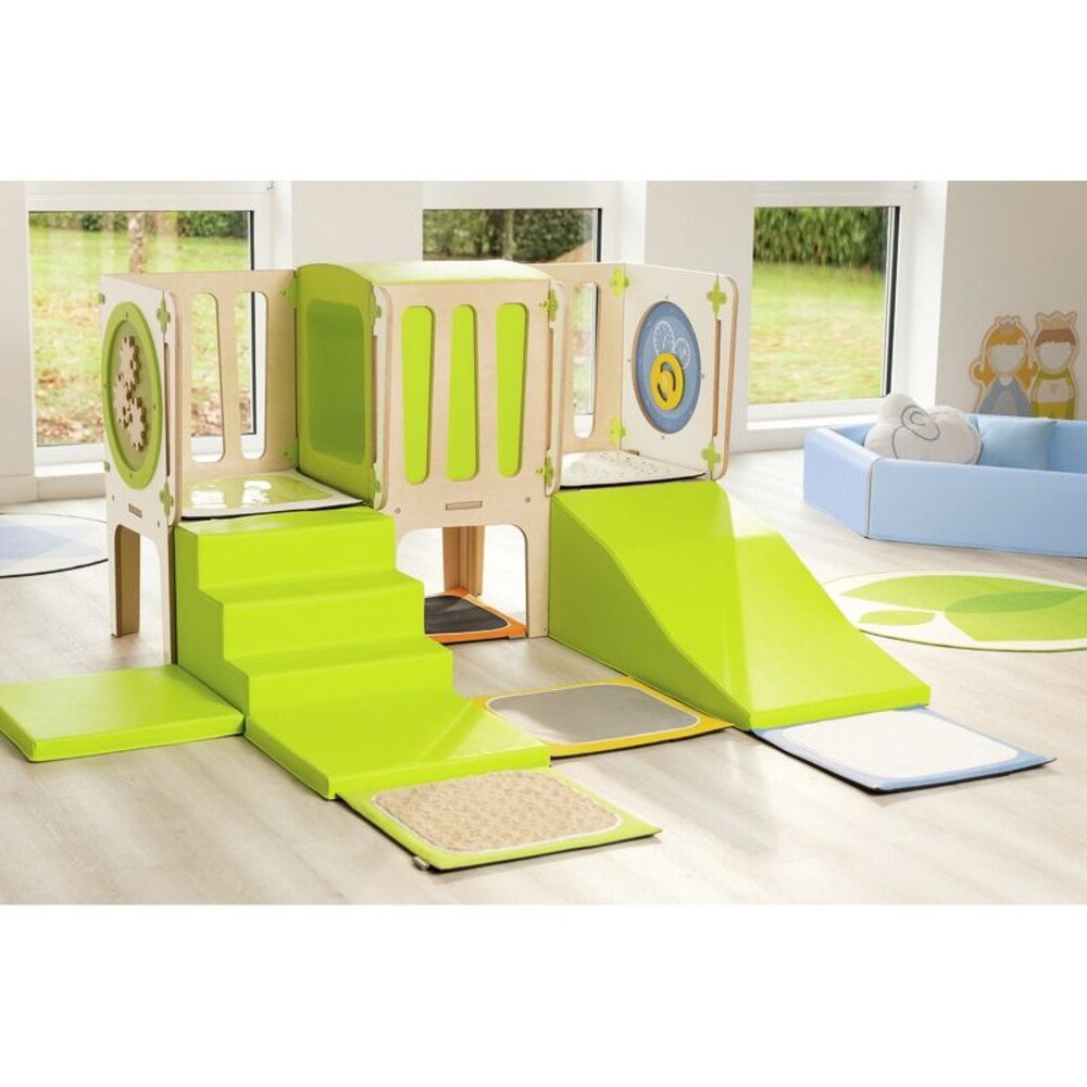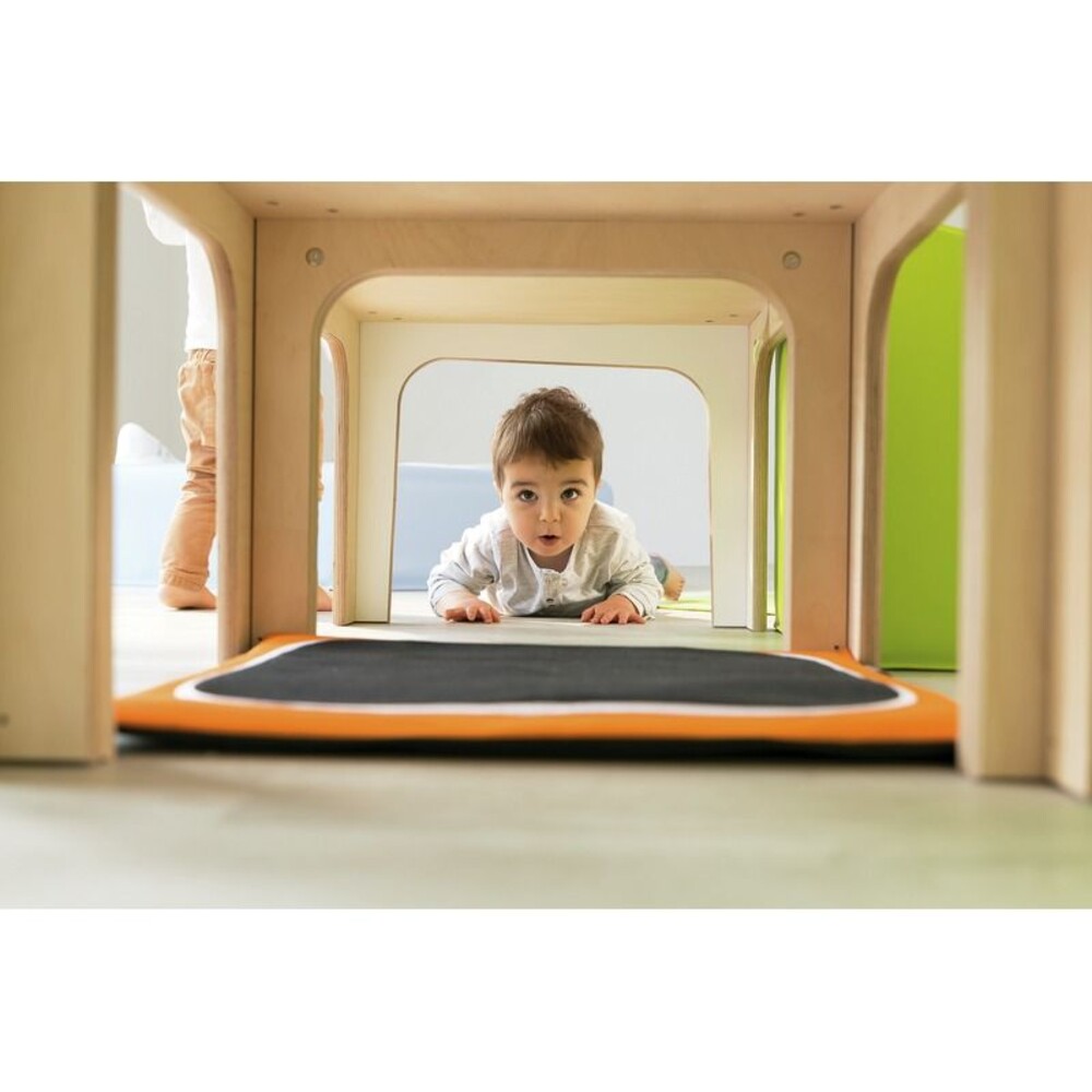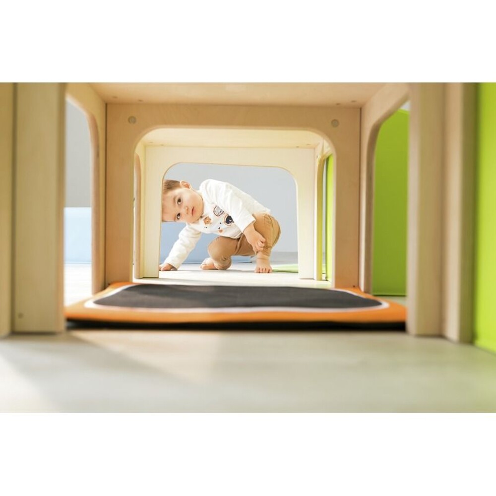 Die Struktur weckt die kindliche Neugier auf vielfältige Weise. Der integrierte Tunnel bietet einen wunderbaren Ort, um sich zu verstecken oder durch die Struktur zu kriechen. Gleichzeitig sammeln die Kinder beim Überwinden von Treppen und weichen Schrägen erste wichtige Erfahrungen mit kleinen Hindernissen. Sie lernen, Risiken altersgerecht einzuschätzen und fassen Vertrauen in die eigenen Bewegungen. Ergänzt wird dieses aktive Erlebnis durch spezielle Spieltafeln, die gezielt die kognitiven Fähigkeiten und die Feinmotorik der Kinder schulen. So wird jeder Tag im Parcours zu einem wertvollen Lernabenteuer.