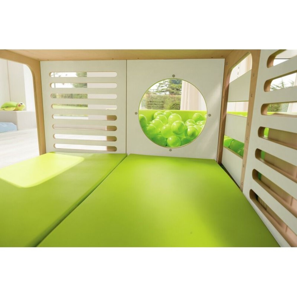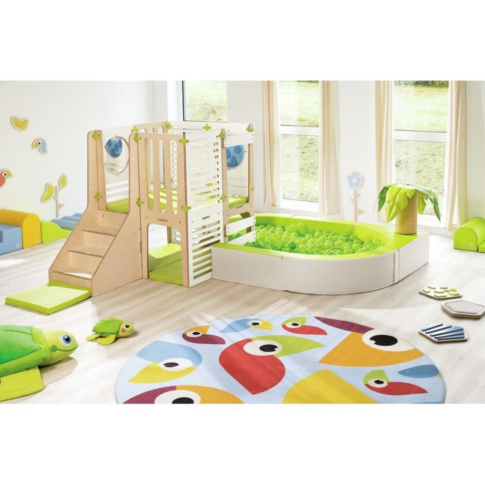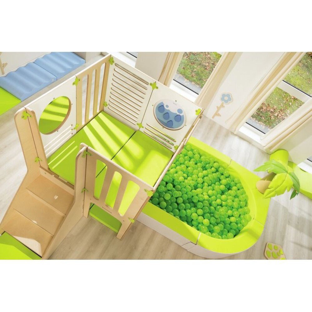 - Anregung der Neugier und Sinne: Spannende Details wie die integrierten Bullaugen machen das Prinzip von Transparenz greifbar. Die Kinder können fasziniert das Bällebad beobachten oder sich in dem gemütlichen Raum unter der Struktur verstecken.
