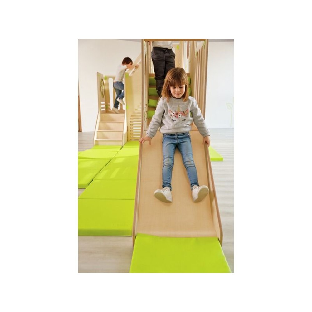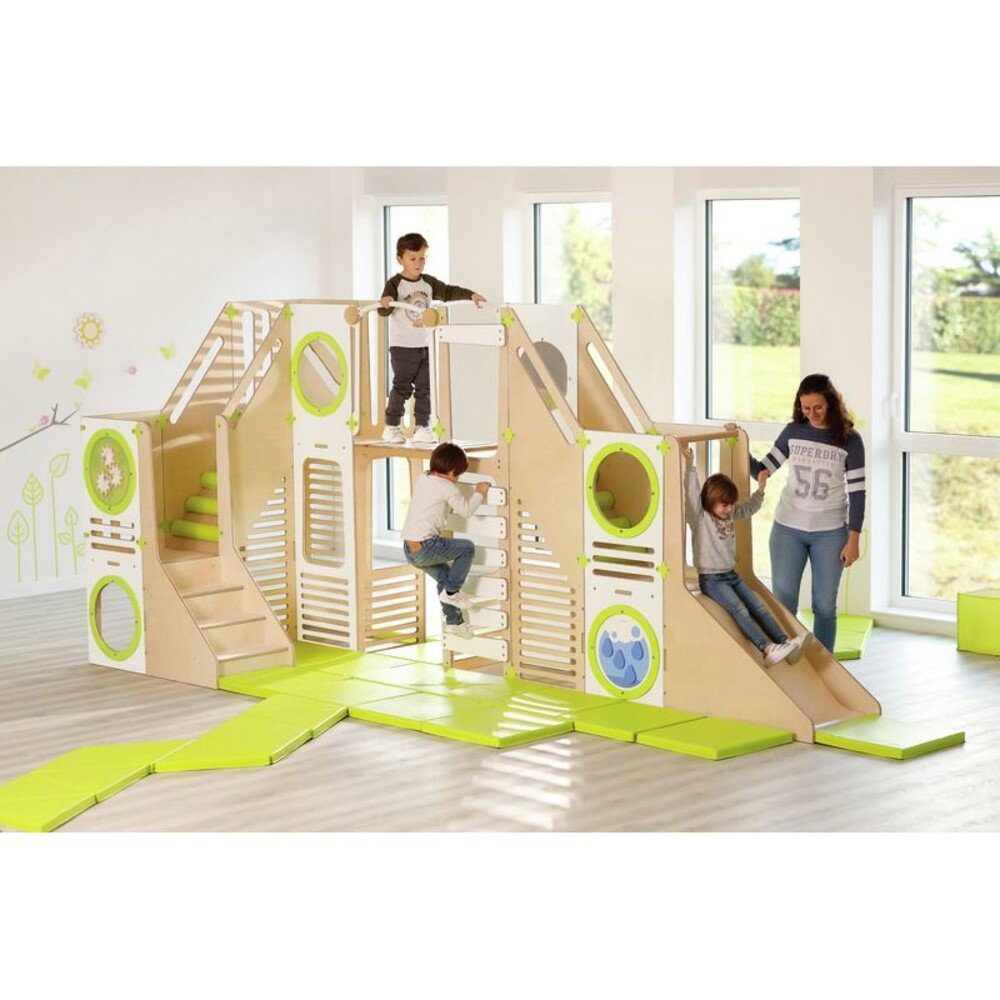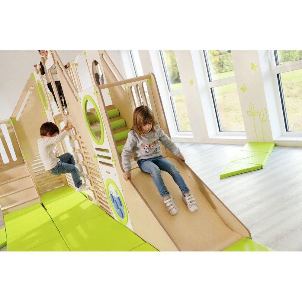 - Körperliche Fähigkeiten ausbauen: Der abwechslungsreiche Parcours bietet unzählige Möglichkeiten für spannende Aktivitäten. Ob beim konzentrierten Klettern, beim fröhlichen Rutschen oder beim flinken Krabbeln durch die Anlage – Ihr Kind trainiert völlig natürlich seine gesamte Muskulatur, die körperliche Koordination und den Gleichgewichtssinn.