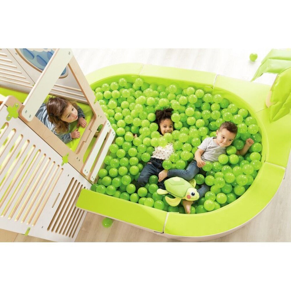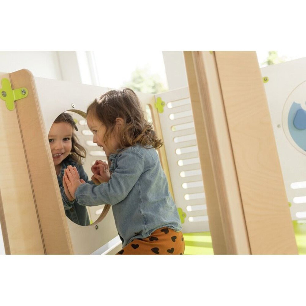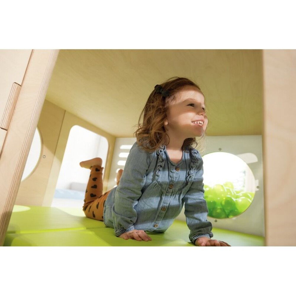 - Anregung der Fantasie und Neugier: Spannende Elemente wie das durchsichtige Bullauge machen das Prinzip von Transparenz greifbar. Der großzügige Raum unter der Struktur eignet sich hervorragend zum Versteckspielen oder für kreative Rollenspiele, beispielsweise als kleiner Marktstand.