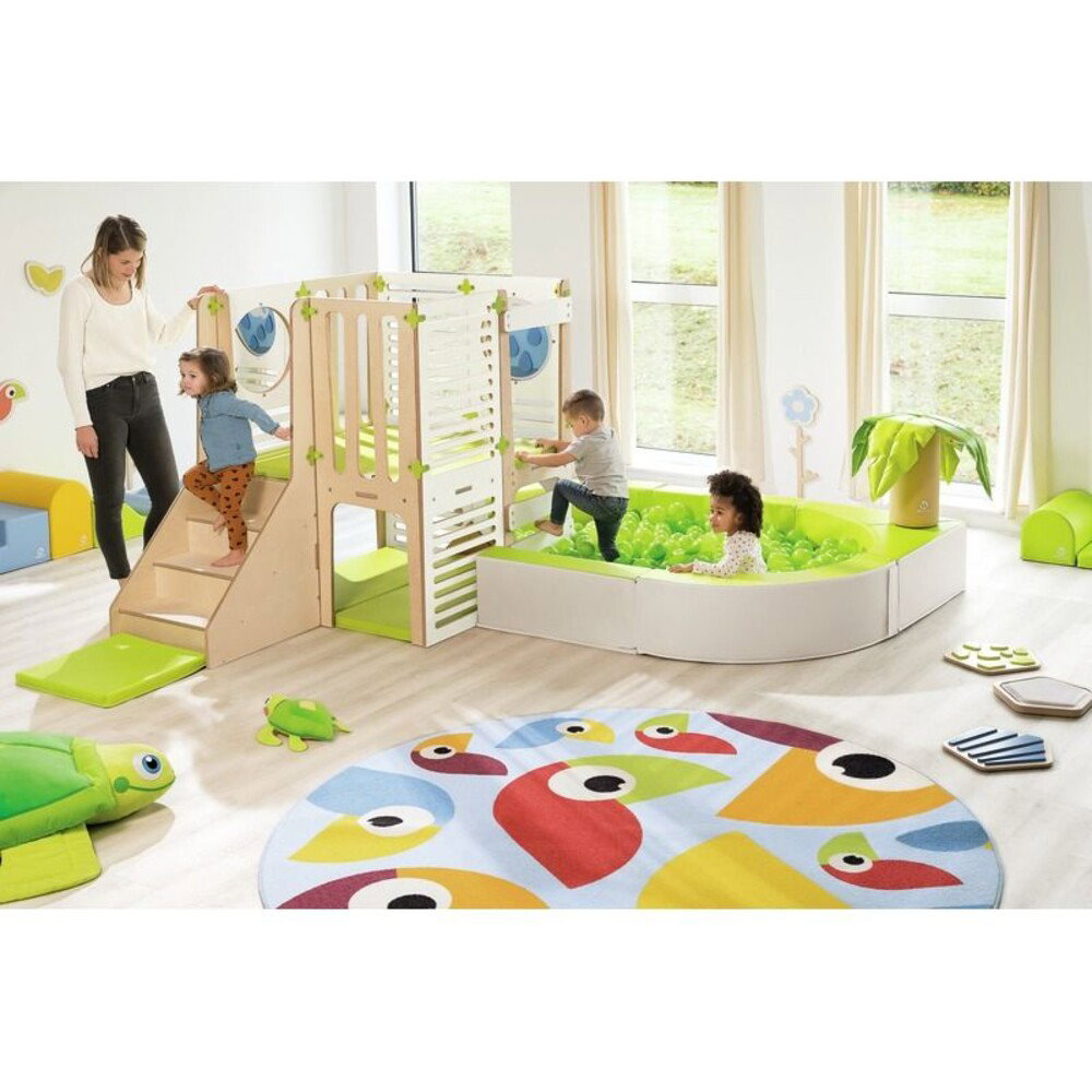 - Förderung der körperlichen Fähigkeiten: Der abwechslungsreiche Parcours lädt Kinder dazu ein, ihre gesamte Muskulatur zu trainieren. Durch das ständige Bewegen, Greifen und Ausbalancieren verbessern sie spielerisch ihre Koordination, Kraft und Körperhaltung.
