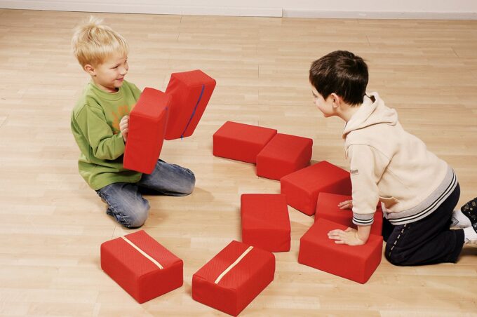Die Stoffhülle der Quader besteht aus einer hochwertigen Mischung aus 53 % Polyester und 47 % Polyvinylchlorid, während das Innenfutter aus Schaumstoff gefertigt ist. Die kleinen Gumminoppen an der Außenseite der Quader verhindern ein Verrutschen und bieten den Kindern ein besonderes haptisches Erlebnis. Das Material ist zudem waschbar bei 60 °C, sodass es leicht zu reinigen und hygienisch bleibt.