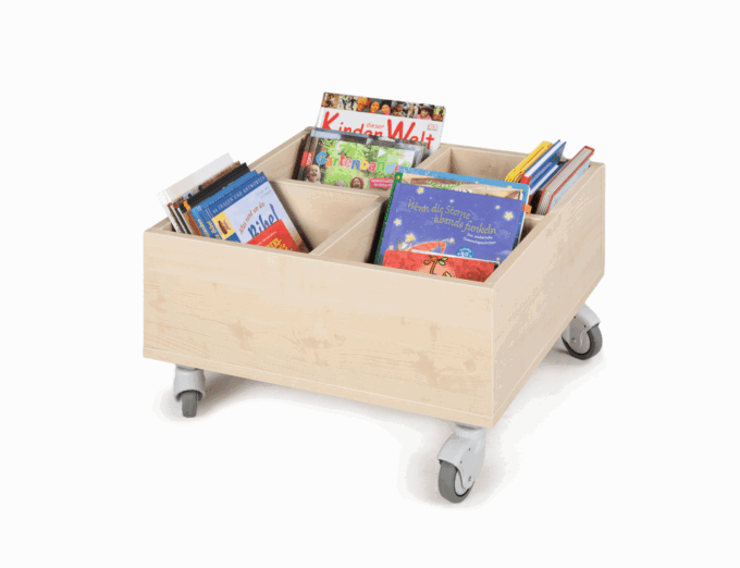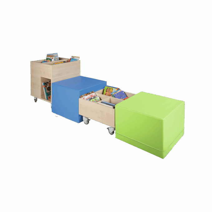 Die im Set enthaltenen Bücherkisten basieren auf einem 60 x 60 cm großen, quadratischen Grundriss. Die Seitenlänge von 60 cm paßt perfekt zu den Cube Sitzelementen. Kombinieren Sie einfach entsprechend den räumlichen Gegegebenheiten, in Reihe angeordnet oder frei aufgestellt. Die Cube Bücherkisten haben 4 Fächer auf der Oberseite und stehen auf 4 fahrbaren Rollen, davon sind 2 feststellbar.