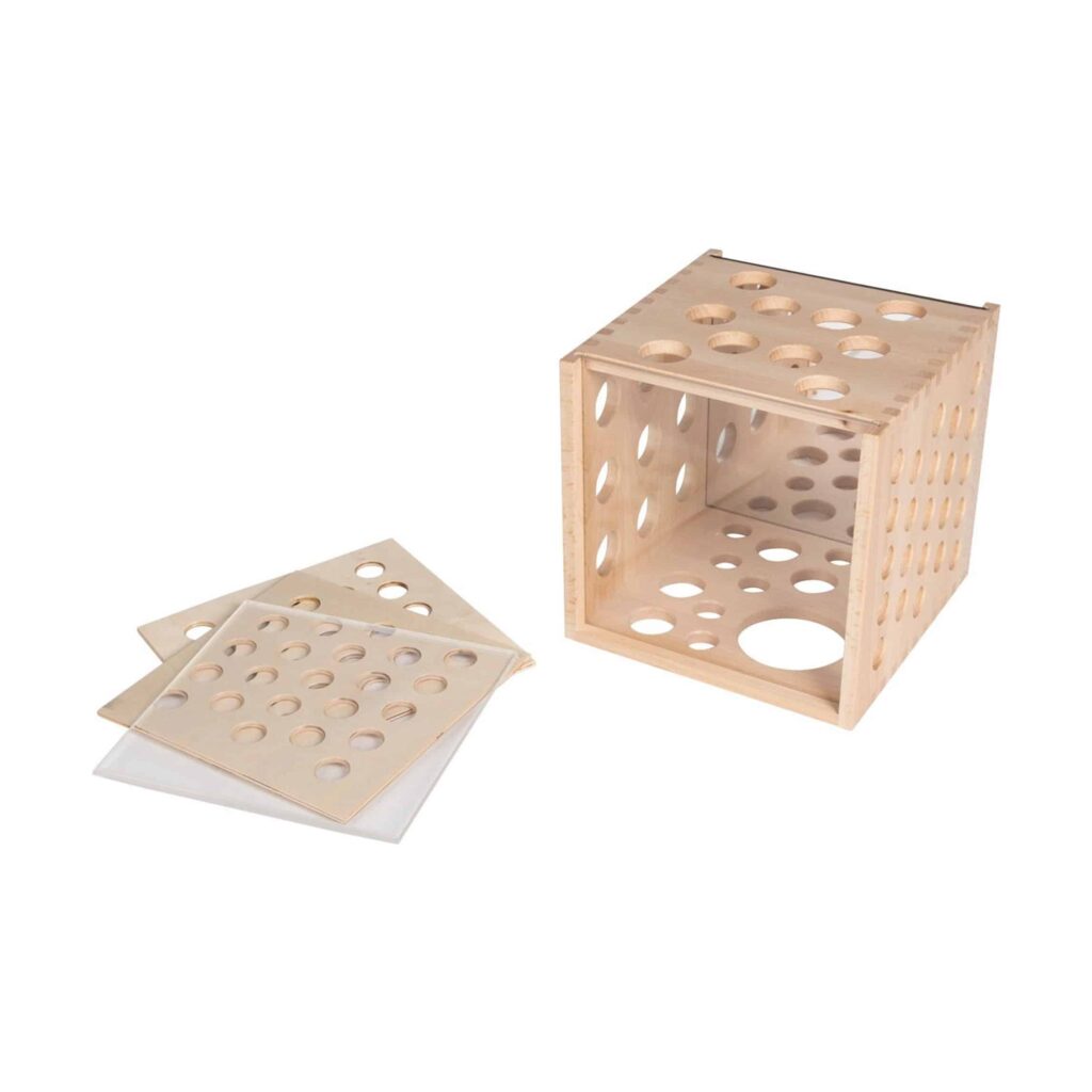 Der Cubelix besteht aus stabilen Komponenten: Ein massiver Buchenholz-Würfel (20 x 20 x 20 cm) bildet die Grundlage des Spiels und sorgt für Langlebigkeit. Im Set enthalten sind auch 2 Platten zum Einschieben mit Löchern, eine transparente Acrylplatte und ein Acrylspiegel. Die enthaltene Spielanleitung hilft Ihnen, das Spiel noch abwechslungsreicher zu gestalten.