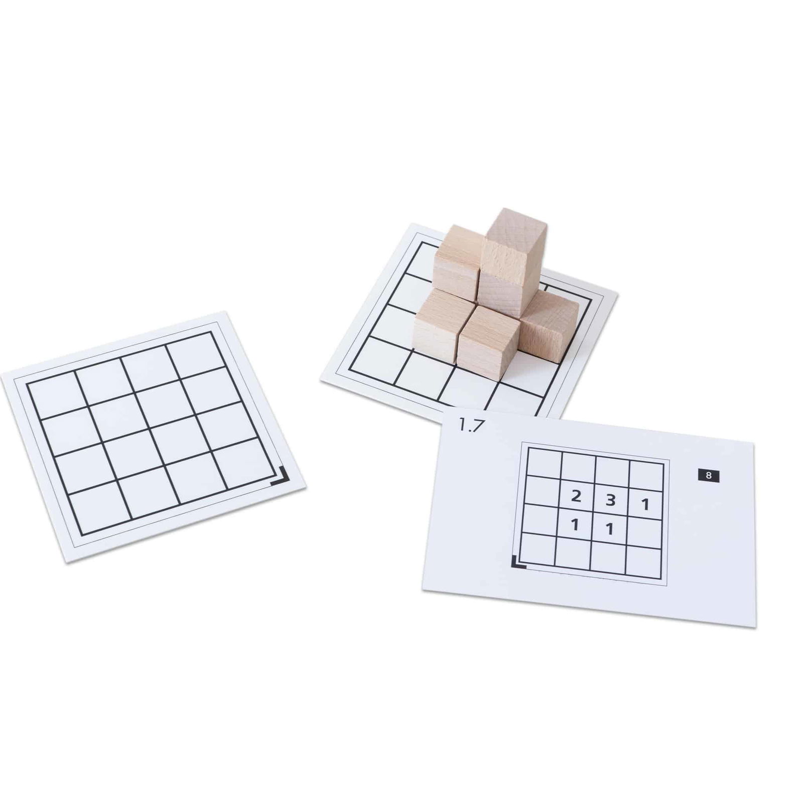 Mit den Holzwürfeln können die Kinder ihre Aufträge direkt auf den Rastertafeln nachbauen. Die Selbstkontrolle ist einfach: Auf der Rückseite jeder Karte findet sich die Lösung in einer 3-dimensionalen Darstellung. Durch das Konstruieren der Aufgaben werden Konzentration, räumliches Vorstellungsvermögen und die Feinmotorik der Kinder geschult.