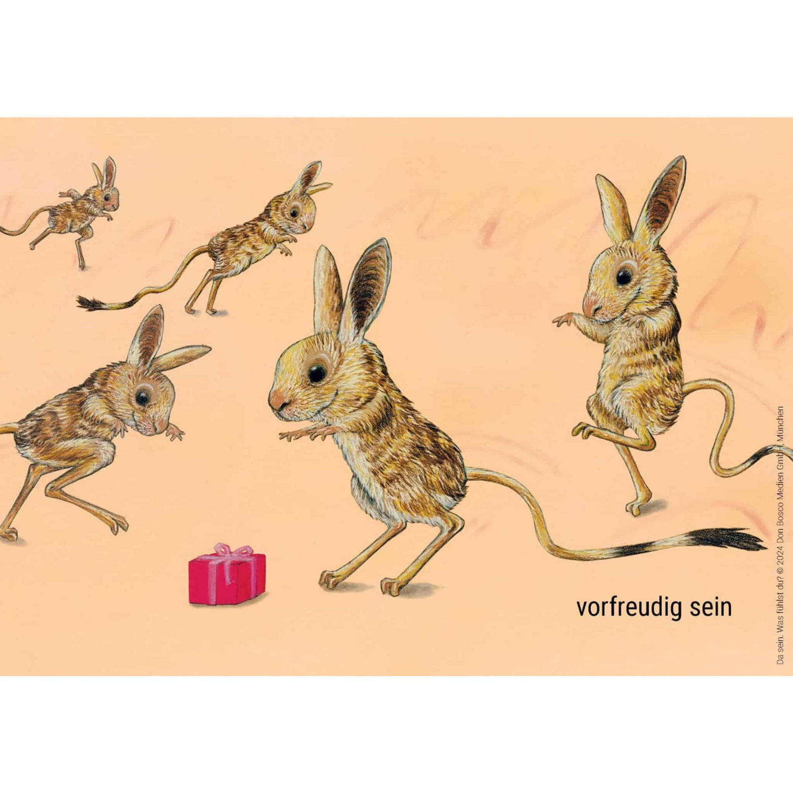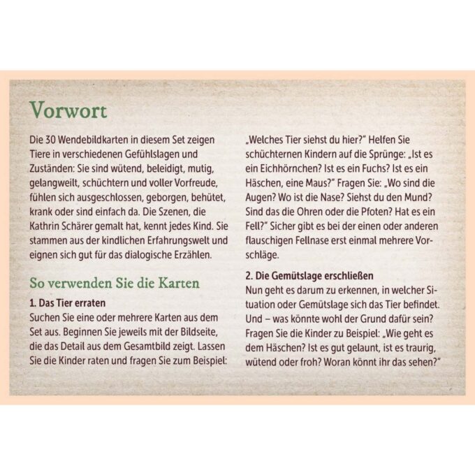 Die Karten sind im praktischen DIN-A5-Format gestaltet und zeigen auf der Vorder- und Rückseite bunte Illustrationen von Tieren, die verschiedene Emotionen ausdrücken. Jedes Bild erzählt eine eigene Geschichte – ob das Hermelin, das ungeduldig in der Warteschlange von einem Fuß auf den anderen tippt, das schüchterne Bärchen, das sich hinter seiner Mama versteckt, oder der wütende Hase, der aufstampft. Diese Szenen helfen Kindern, Gefühle und Alltagssituationen zu verstehen und auszudrücken.